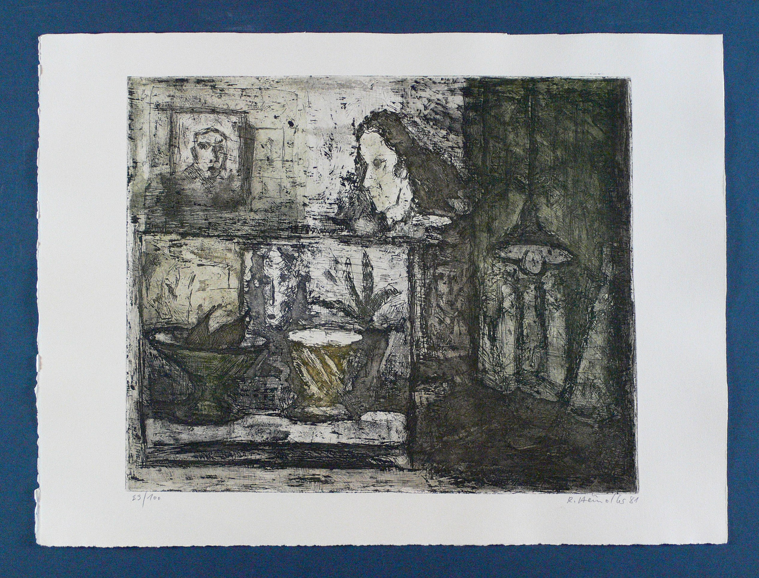 Aus: Jubiläumsmappe II. Farbige Grafik (Leipzig: Galerie am Sachsenplatz 1981). – Außerhalb der Darstellung in Bleistift signiert und datiert rechts unten sowie links unten mit eigenhändiger Auflagenbezeichnung versehen. Am Blattrand links unten Wasserzeichen der Hahnemühle. – Tadelloses Exemplar.