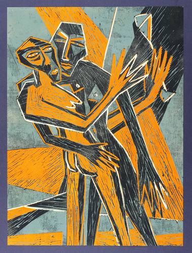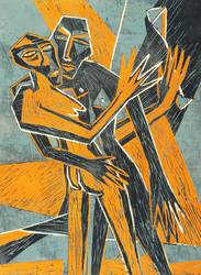 1990. Farbholzschnitt, in Blau, Orange & Schwarz, auf Karton. – Originale Künstlergrafik, von Klaus Süß. – Auflage Exemplar Nr. 9/20. – 47,5 x 35,0 cm (Darstellung / Blatt).