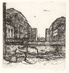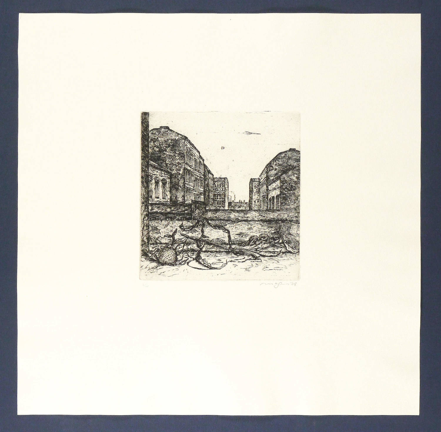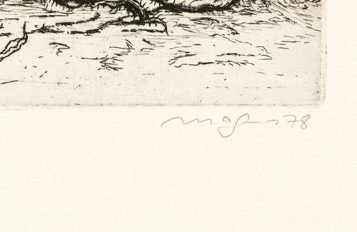 1978. Radierung / Strichätzung, in Schwarz, auf schwerem chamois Bütten. – Originale Künstlergrafik, von Klaus Magnus. – Auflage Exemplar Nr. 6/60. – 20,8 x 19,7 cm (Darstellung / Platte), 49 x 50 cm (Blatt).