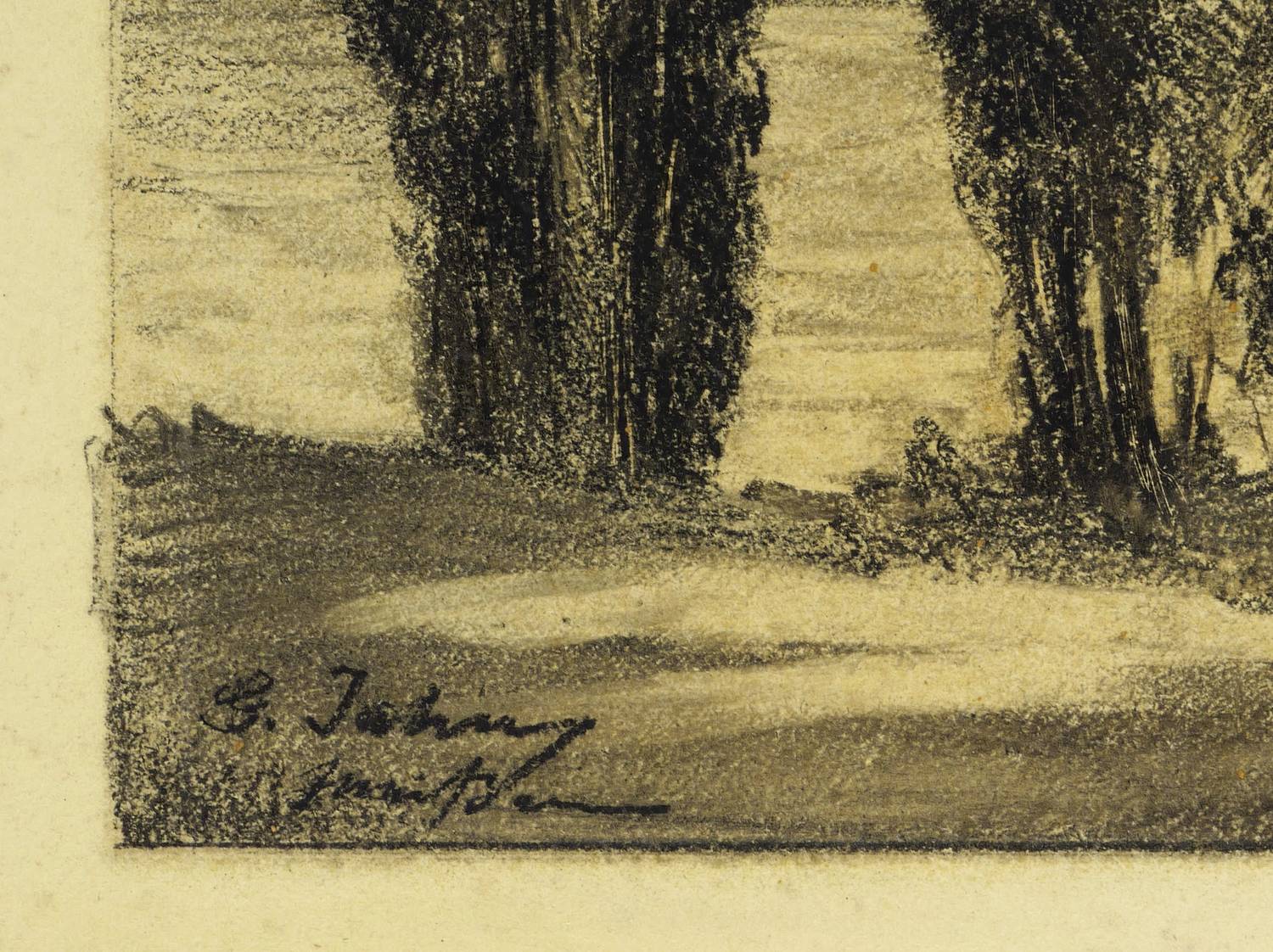 Um 1910. Zeichnung / Graphit- & Kohlezeichnung, partiell gewischt & geschabt, auf gelb getöntem Karton. – Originale Künstlergrafik, von Georg Jahn. – Unikat. – 39,6 x 50,3 cm (Darstellung), 45,5 x 58 cm (Blatt).