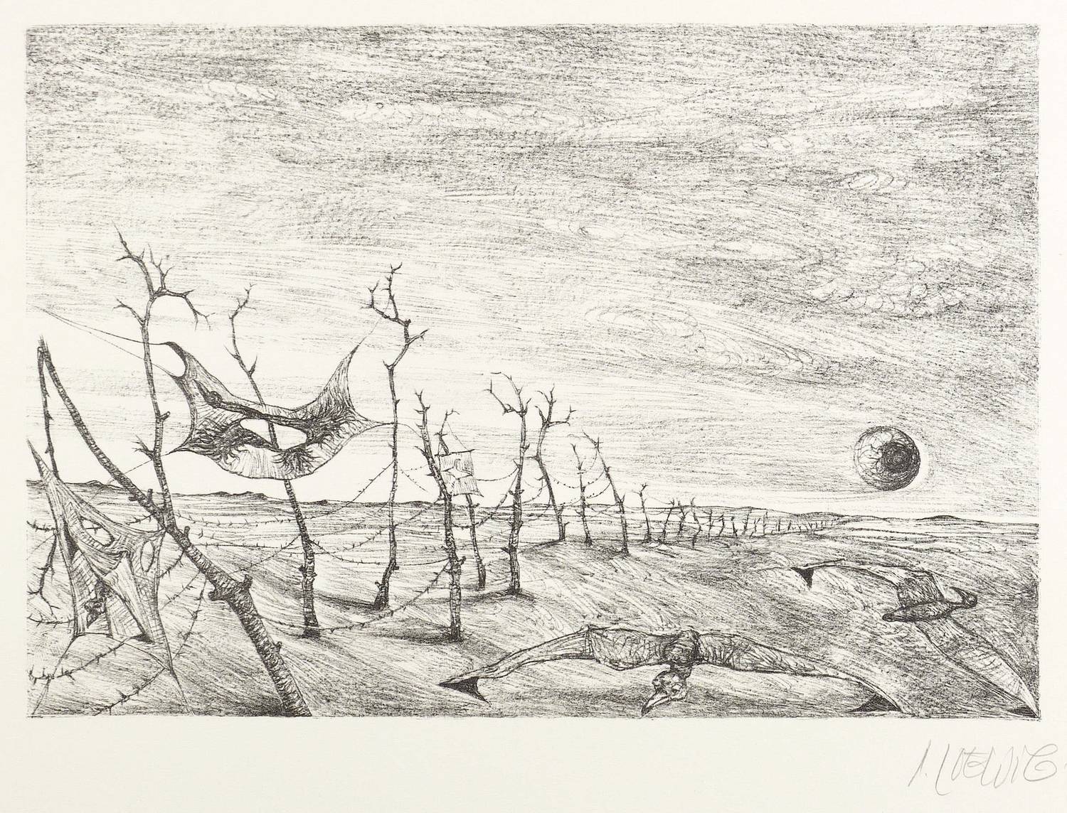 Roger Loewig (1930 Striegauz - 1997 Berlin). Deutscher Zeichner, Maler und Schriftsteller, Vertreter des Phantastischen Realismus. Nach Kindheit in Oels / Schlesien und Jarotschin / Großpolen 1945 Flucht nach Obercunewalde in der Lausitz. 1951-53 Ausbildung zum Neulehrer, danach als Lehrer für Russisch, Deutsch und Geschichte in Berlin-Köpenick. Daneben entstehen autodidaktisch Aquarelle und Gouachen. 1961/62 Tuschzeichnungs-Serie "Aus deutscher Vergangenheit und Gegenwart" gegen den Mauerbau. 1963/64 Inhaftierung als Systemkritiker. 1965 Aufnahme im Verband Bildender Künstler Deutschlands (VBKD). In Belzig freischaffend als Zeichner und Lithograf. 1966-73 Ausstellungen der "Erfurter Ateliergemeinschaft". 1972 Ausreise nach West-Berlin, Mitglied der Künstlergruppe "Berliner Malerpoeten". 1997 Verdienstkreuz 1. Klasse der Bundesrepublik Deutschland.