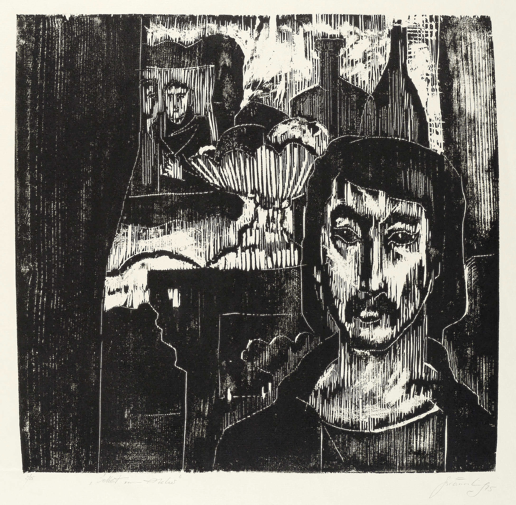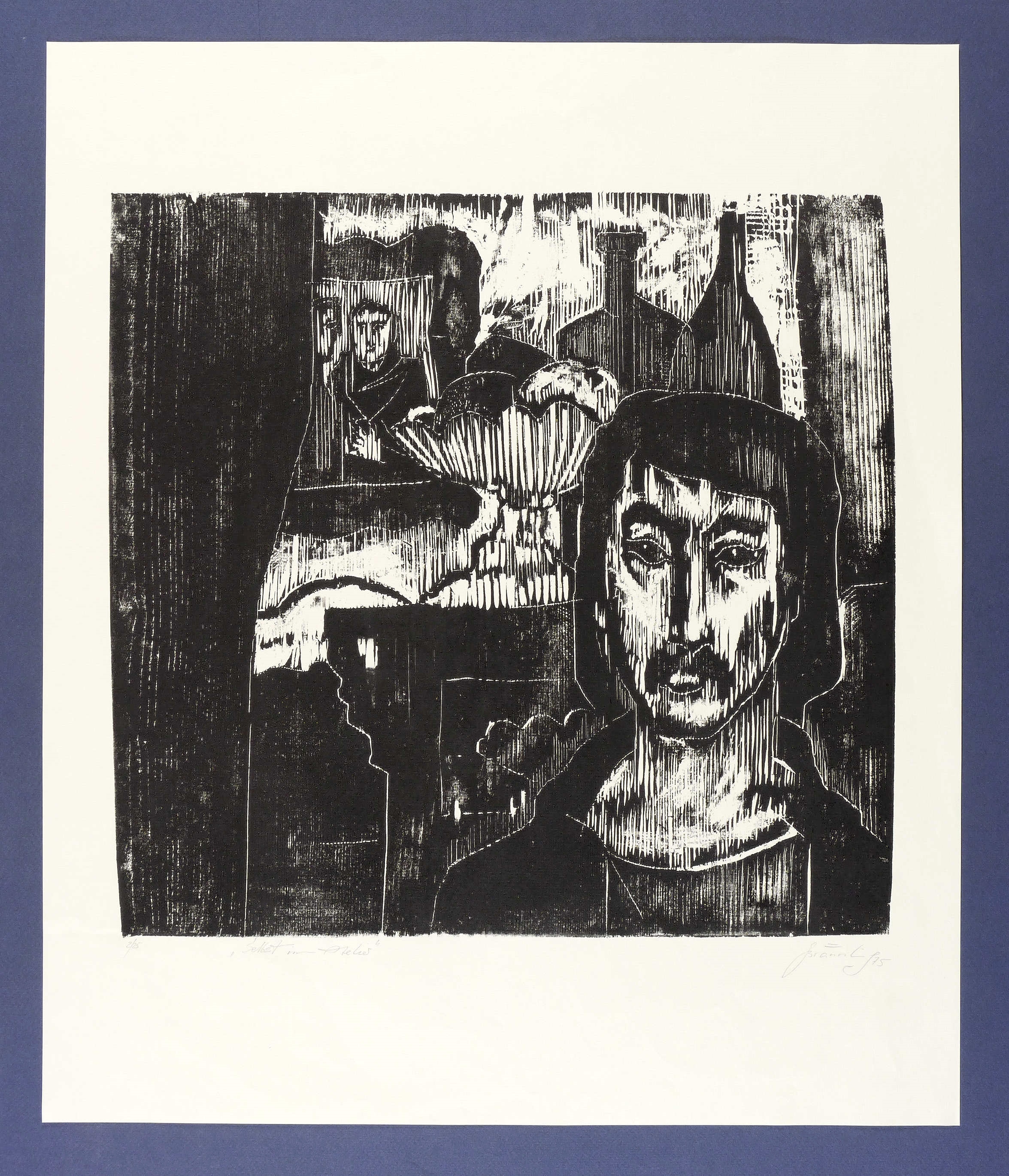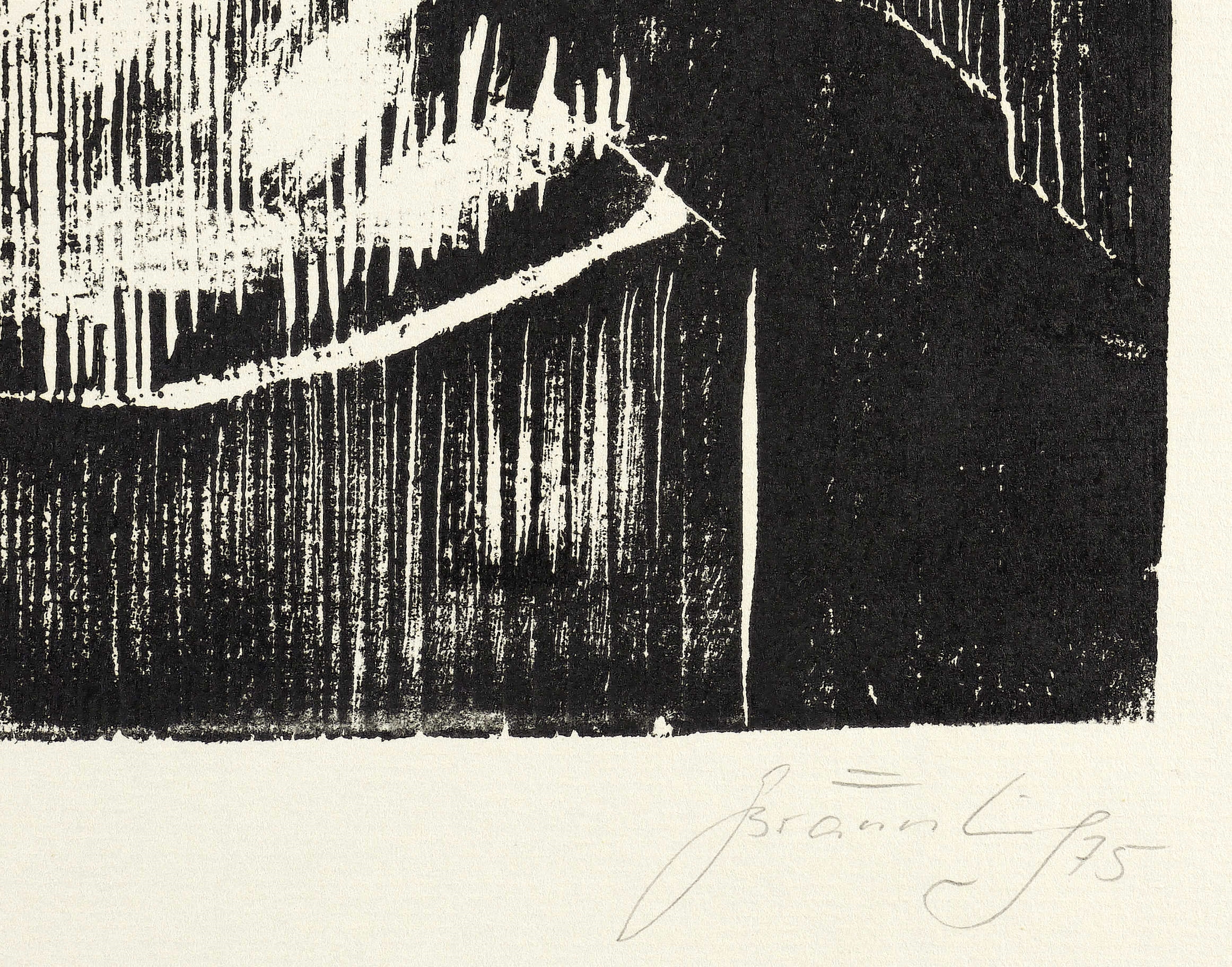 1975. Holzschnitt, in Schwarz, auf hellgelbem Achat-Bütten. – Originale Künstlergrafik, von Gottfried Bräunling. – Auflage Exemplar Nr. 2/25. – 38,7 x 40,9 cm (Darstellung / Druckstock), 57 x 48 cm (Blatt).