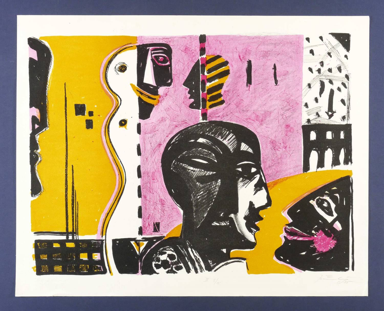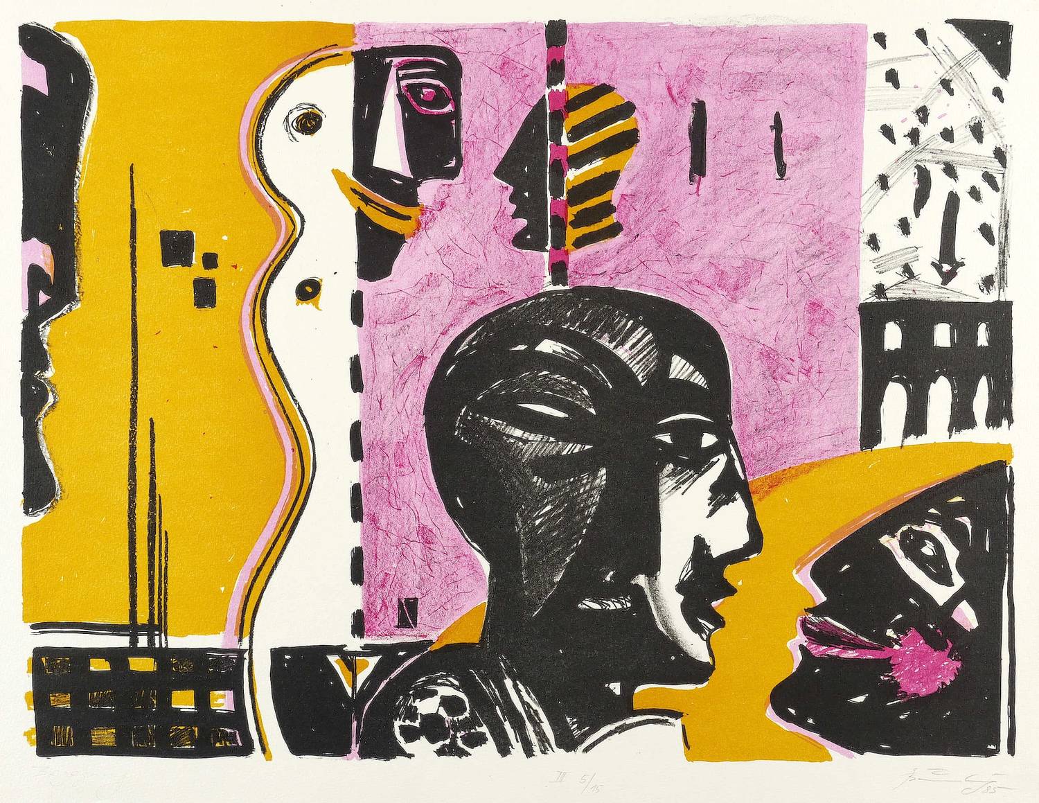 1985. Farblithografie / Kreide- & Pinsellithografie, in 4 Farben, auf hartem Maschinenbütten. – Originale Künstlergrafik, von Gottfried Bräunling. – Auflage Exemplar Nr. 5/15. – 45,6 x 60,7 cm (Darstellung / Druckbild), 53 x 66,5 cm (Blatt).