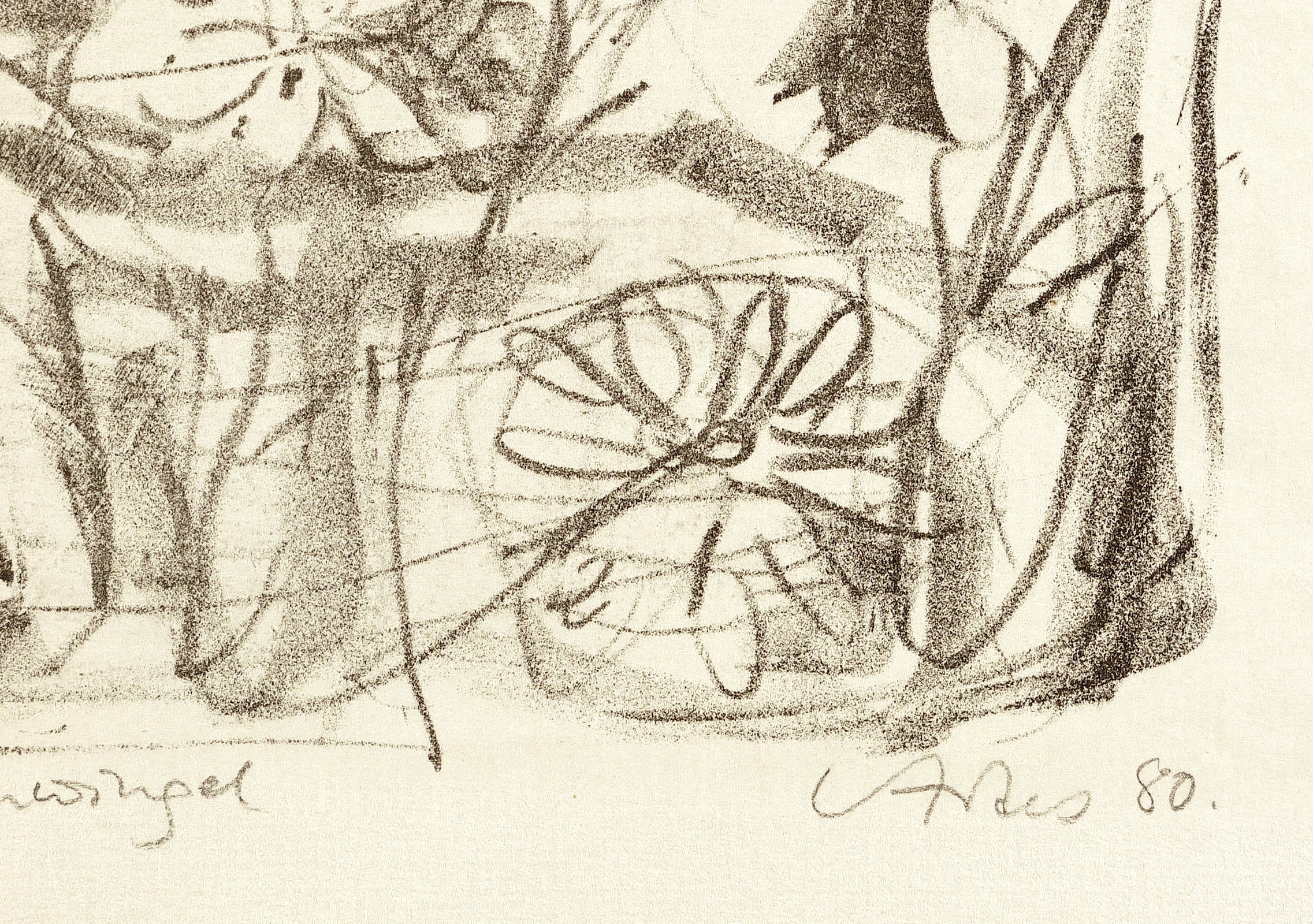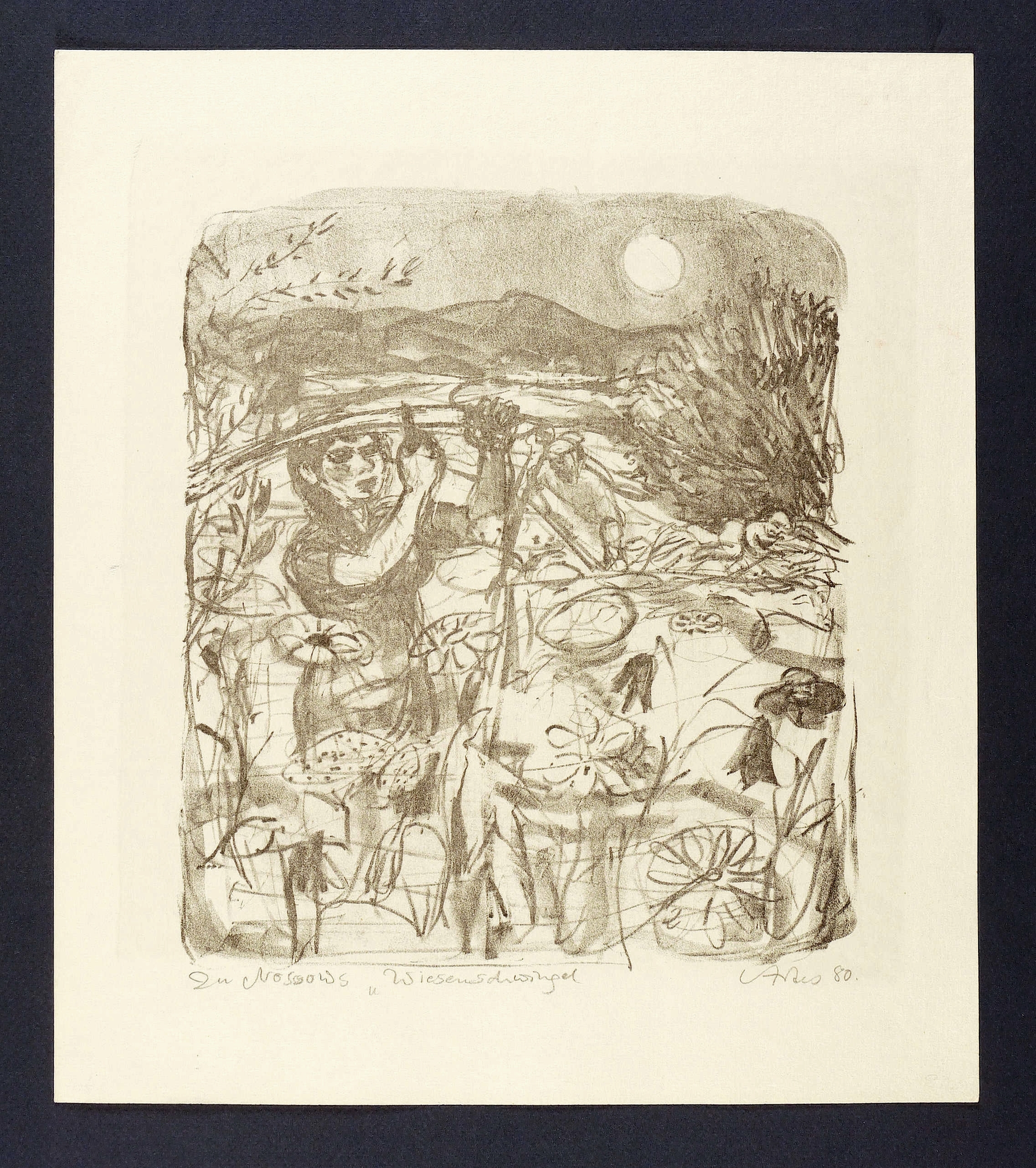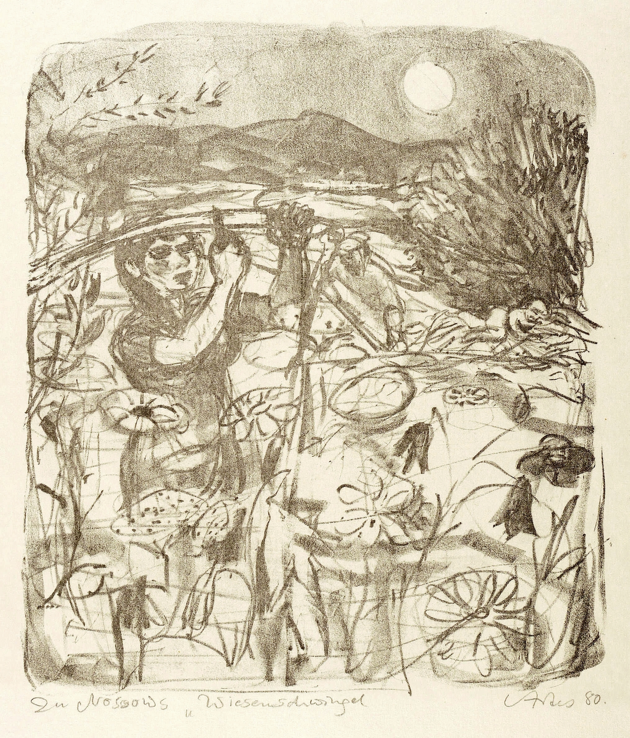 1980. Lithografie / Kreidelithografie, in Schwarz, auf hellgelbem Maschinenbütten. – Originale Künstlergrafik, von Sigrid Artes. – 26,5 x 22,5 cm (Darstellung), 36 x 31 cm (Blatt).