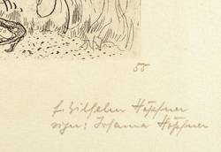 Wilhelm Höpfner (1899 Magdeburg - 1968 Magdeburg). Deutscher Maler und Grafiker. 1918 ein Semester Ausbildung an der Kunstgewerbe- und Handwerkerschule in Magdeburg bei Richard Winckel. 1918-21 Studium an der Staatlichen Kunstschule Berlin. 1921-23 Mitglied der Künstlervereinigung 'Die Kugel'. Teilnahme an der Berliner Sezession. Bekanntschaft mit Käthe Kollwitz und Max Liebermann. 1933-45 Beschlagnahmung seiner Arbeiten für die Aktion "Entartete Kunst". Ab 1955 Einzelausstellungen. 1966 Puppengestaltung, Bühnenbild und Gesamtausstattung für die Inszenierung 'Die Himmelfahrt der Galgentoni' von Egon Erwin Kisch am Städtischen Puppentheater Magdeburg.