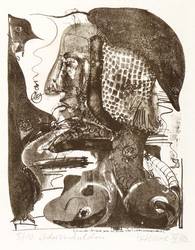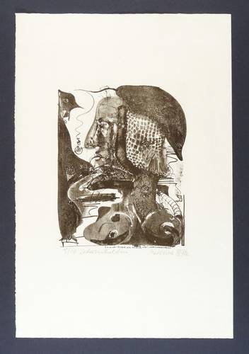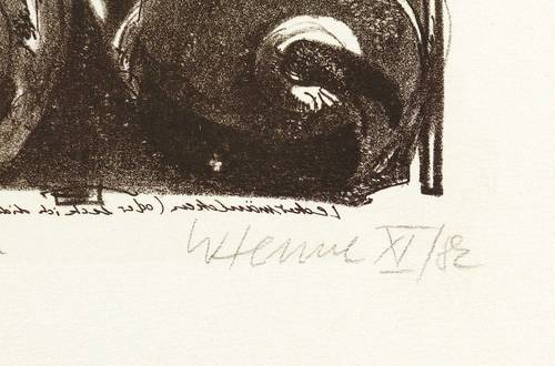 1982. Lithografie / Kreidelithografie, in Schwarz, auf hellem Aquarellkarton. – Von Wolfgang Henne. – Auflage Exemplar Nr. 5/10. – 27,3 x 22,3 cm (Darstellung / Druckbild), 55,5 x 37 cm (Blatt).