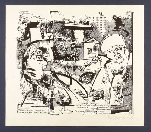 Rechts unten in Bleistift signiert und datiert. In der Platte reiche typografische Inschrift. – Sehr guter Erhaltungszustand.