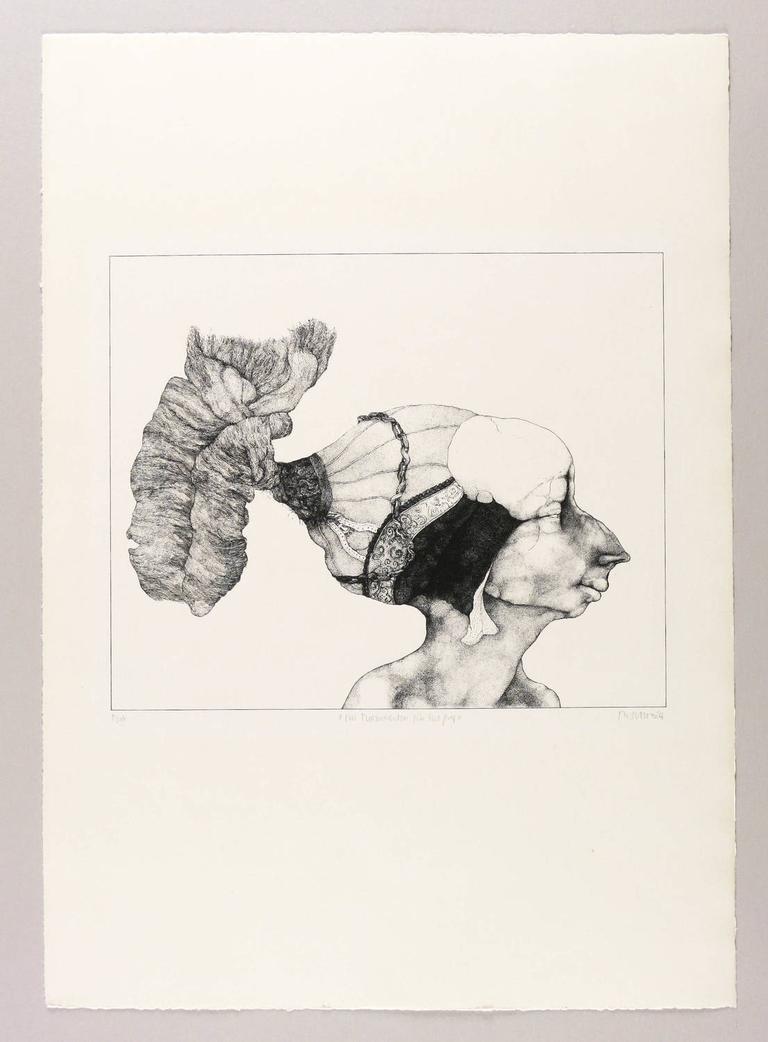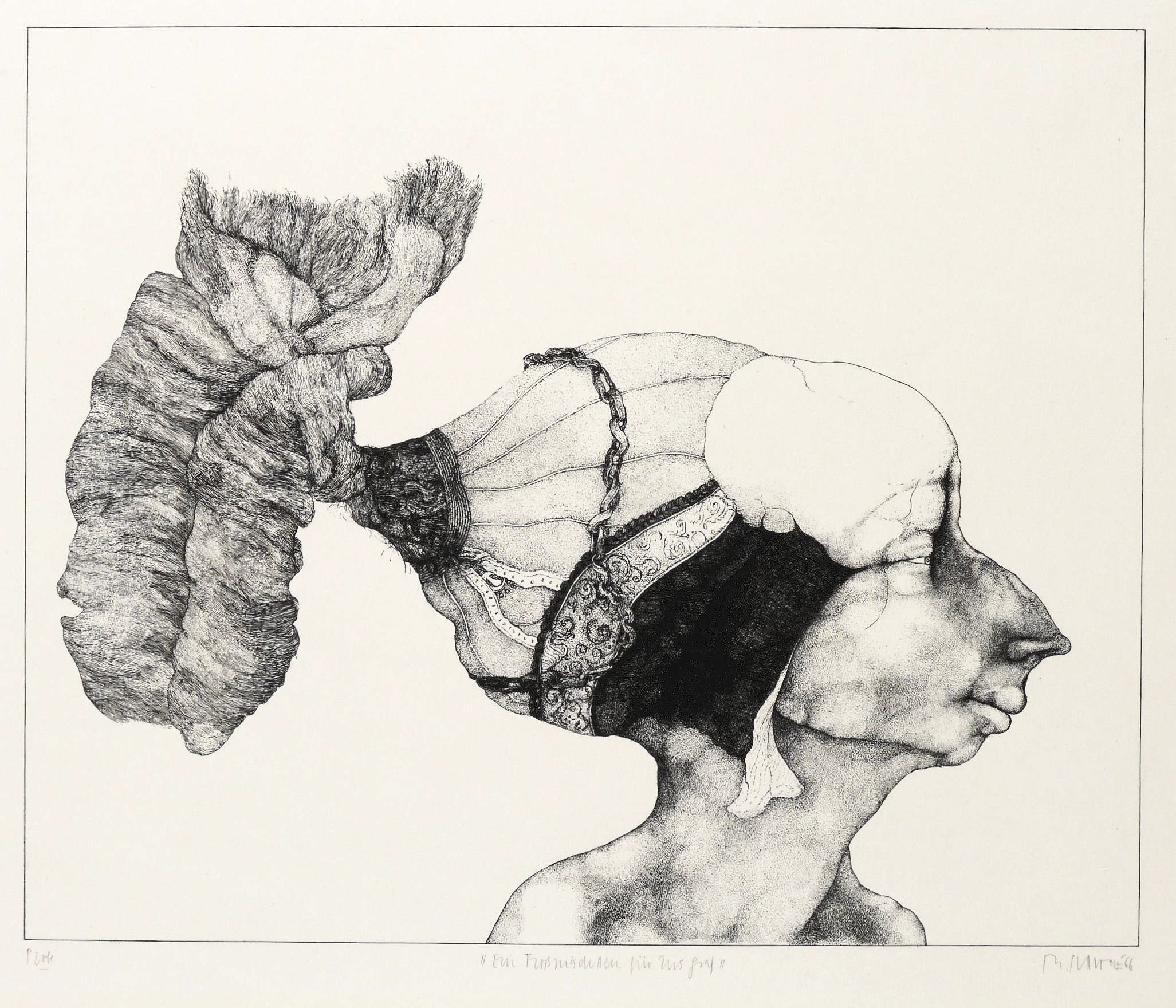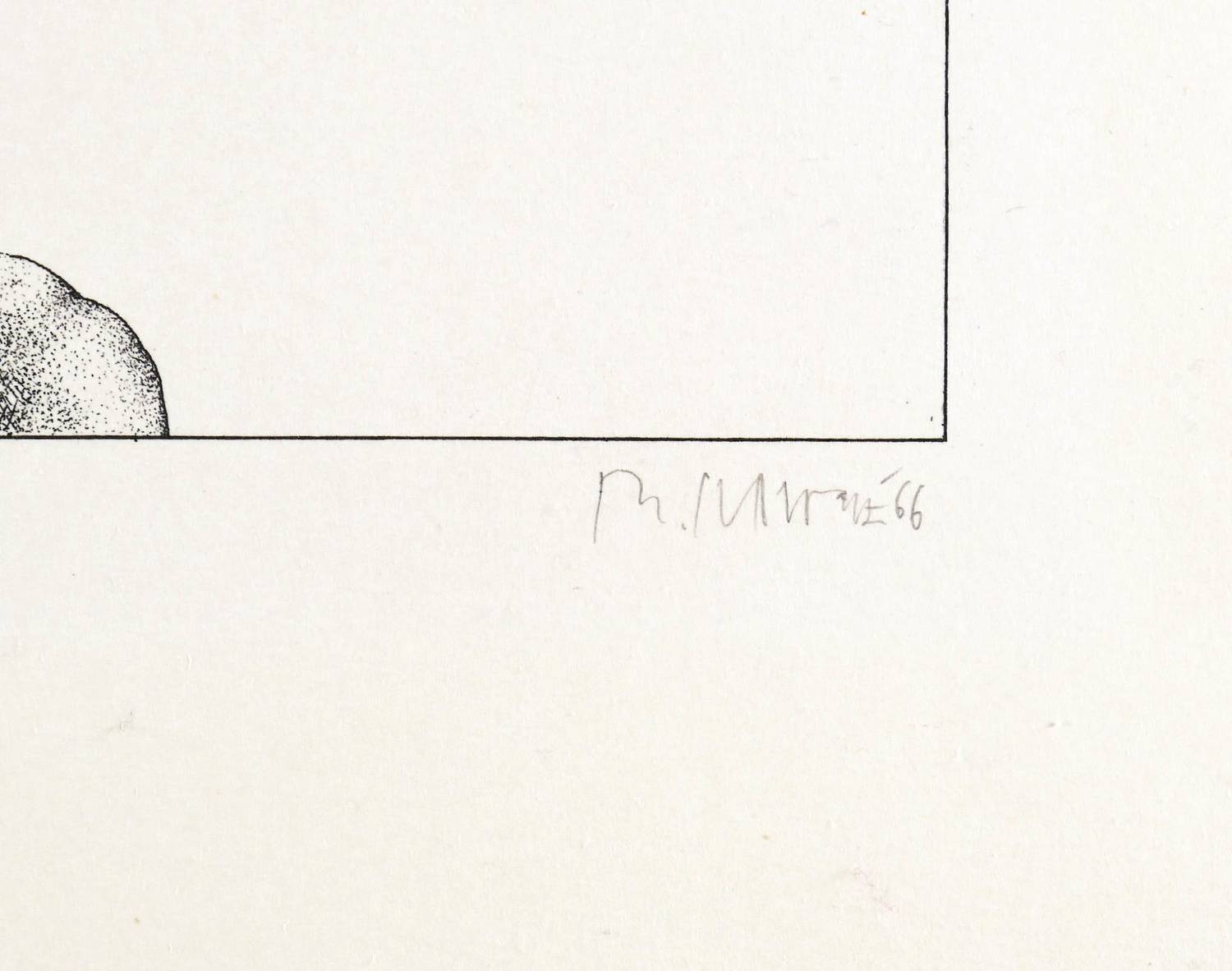 1966. Lithografie / Federlithografie, in Schwarz, partiell punktiert, auf hellchamois Velinkarton. – Originale Künstlergrafik, von Reiner Schwarz. – Probedruck. – 27,7 x 33,8 cm (Darstellung / Einfassungslinie), 53 x 46 cm (Blatt).