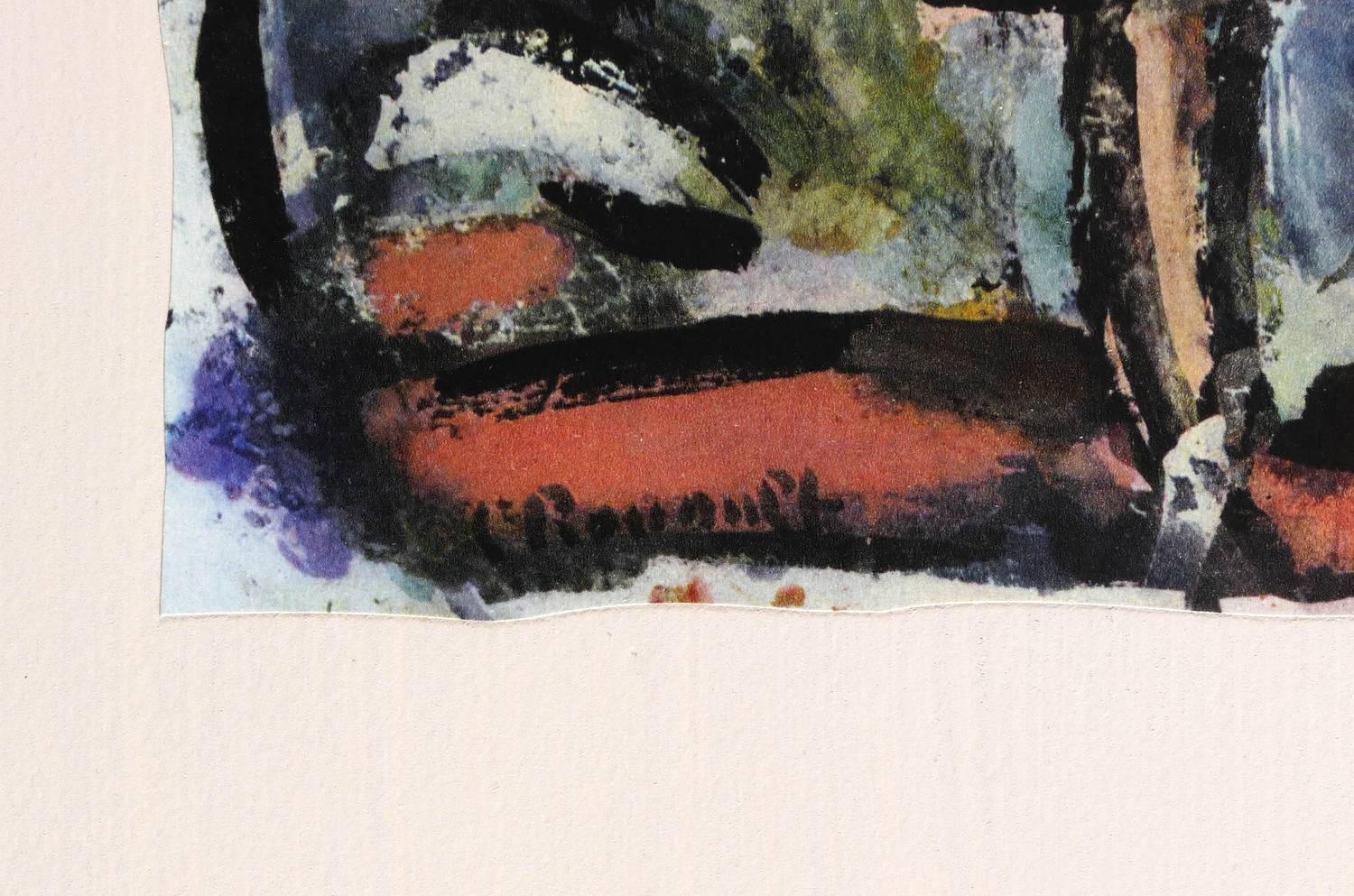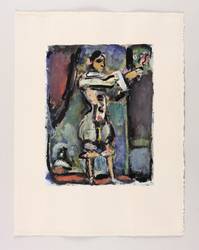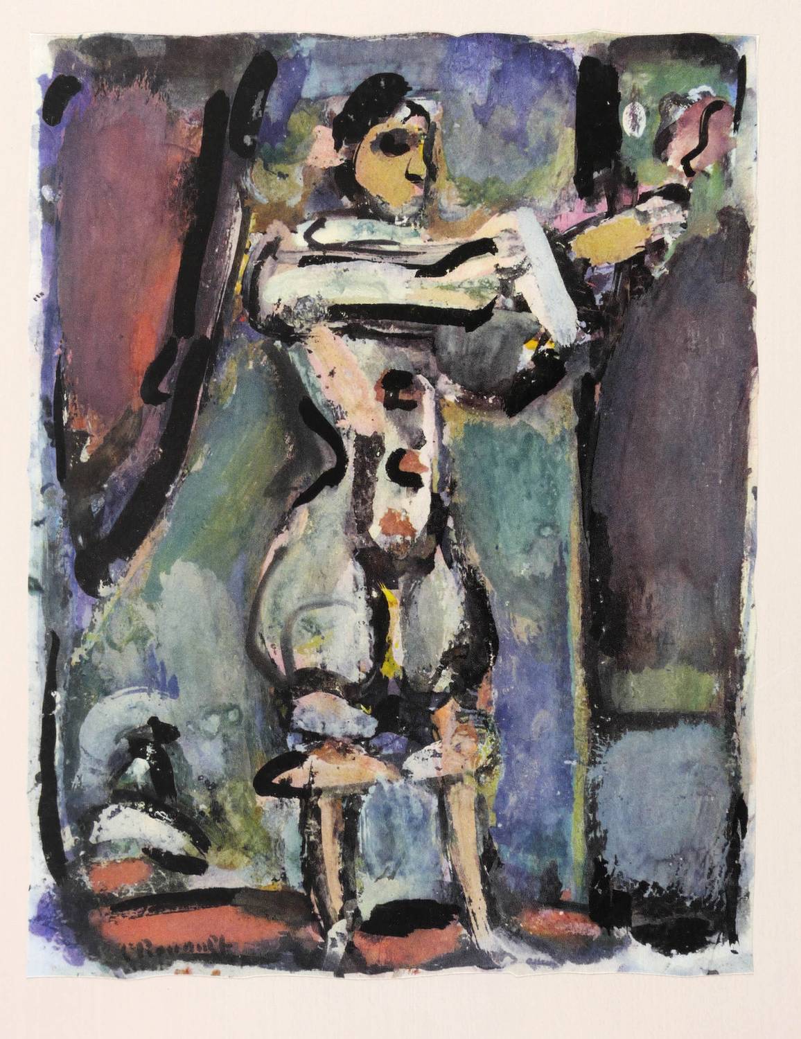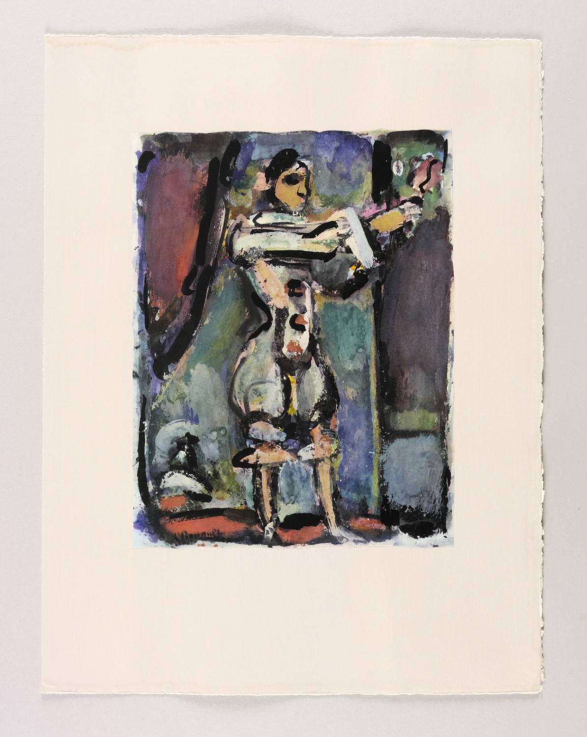 Aus: Georges Rouault, Divertissement (Paris: E. Teriade 1943). – In der Platte links unten signiert: ″G Rouault″. Auf dem Trägerbütten verso aufgedruckt der handschriftliche Titel des Künstlers. – Sehr aufwendiger Mehrfarbendruck nach der Gouache bei Draeger Frères, Paris. Die Drucke wurden unregelmäßig beschnitten und auf in Grau-Rosé getöntes Arches-Bütten aufgezogen. – Tadelos. Sehr guter Zustand.