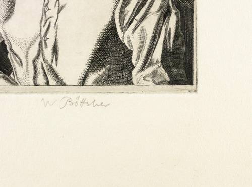 Wolfgang Böttcher (1948 Leipzig, lebt und arbeitet in Muschwitz und Leipzig). Deutscher Maler und Grafiker. 1964-66 Lehre als Akzidenzsetzer bei Offizien Andersen Nexö, Leipzig. 1966-71 Studium an der Hochschule für Grafik und Buchkunst (HGB) Leipzig, Diplom Malerei / Freie Grafik bei Wolfgang Mattheuer. 1974-77 Aspirantur in der Radierwerkstatt an der HGB Leipzig. 1982-84 Mitarbeit in den Ateliers von Werner Tübke in Leipzig und Frankenhausen. 1982-86 Fördervertrag als Maler und Zeichner mit der Universität Leipzig. 1987 Reise mit dem Maler Gerald Müller-Simon nach Havanna und Santiago di Cuba. 1989 Aufenthalte in Paris und erste Reise nach Oberitalien. 1990 Mitbegründer des Kunstverein PIKANTA. Pflegt in seiner künstlerischen Betätigung als Grafiker einen virtuosen Umgang mit der Technik des Kupferstichs.