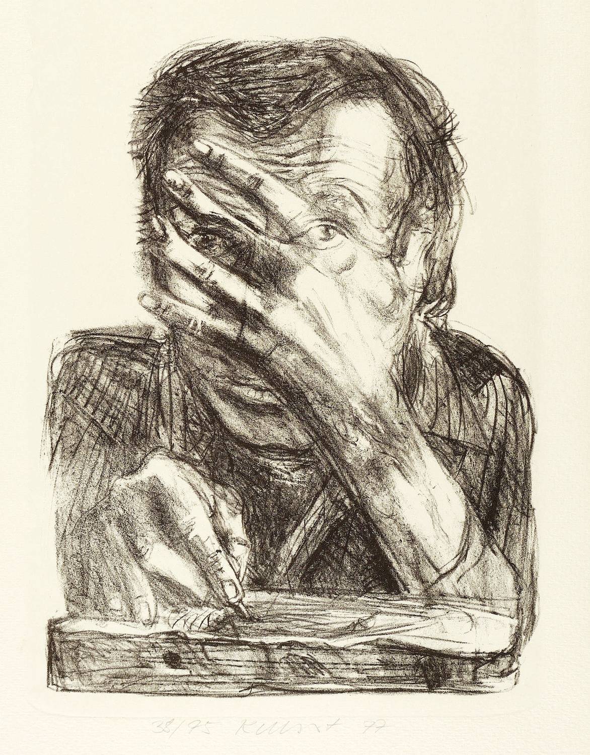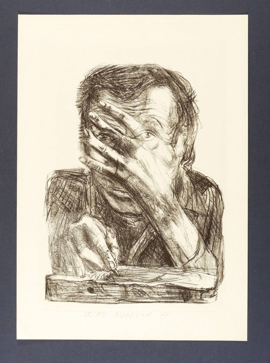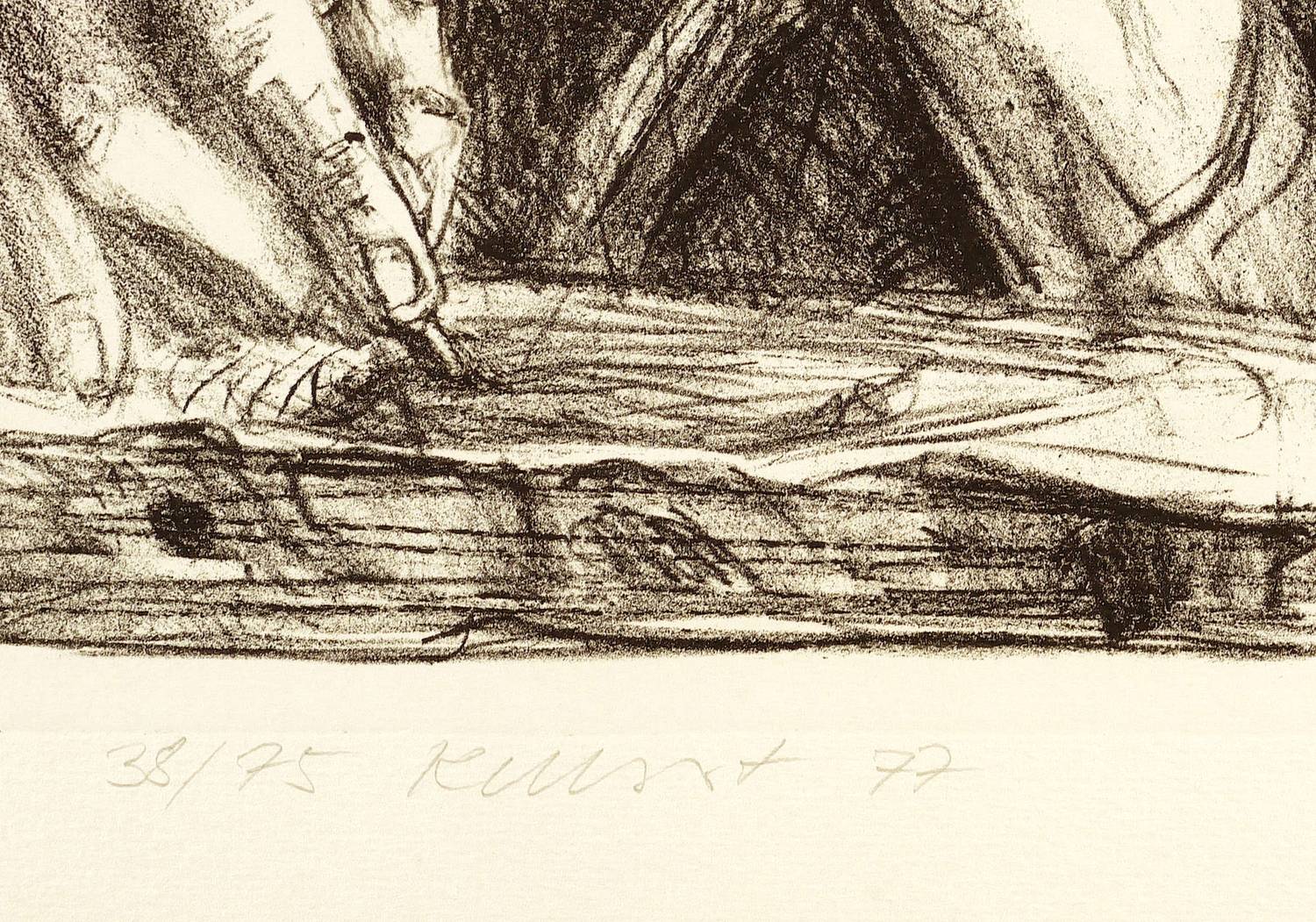 1977. Lithografie / Kreidelithografie, in Schwarz, auf hartem hellchamois Büttenkarton. – Originale Künstlergrafik, von Rolf Kuhrt. – Auflage Exemplar Nr. 38/75. – 31,1 x 23,2 cm (Darstellung / Druckbild), 42 x 30 cm (Blatt).