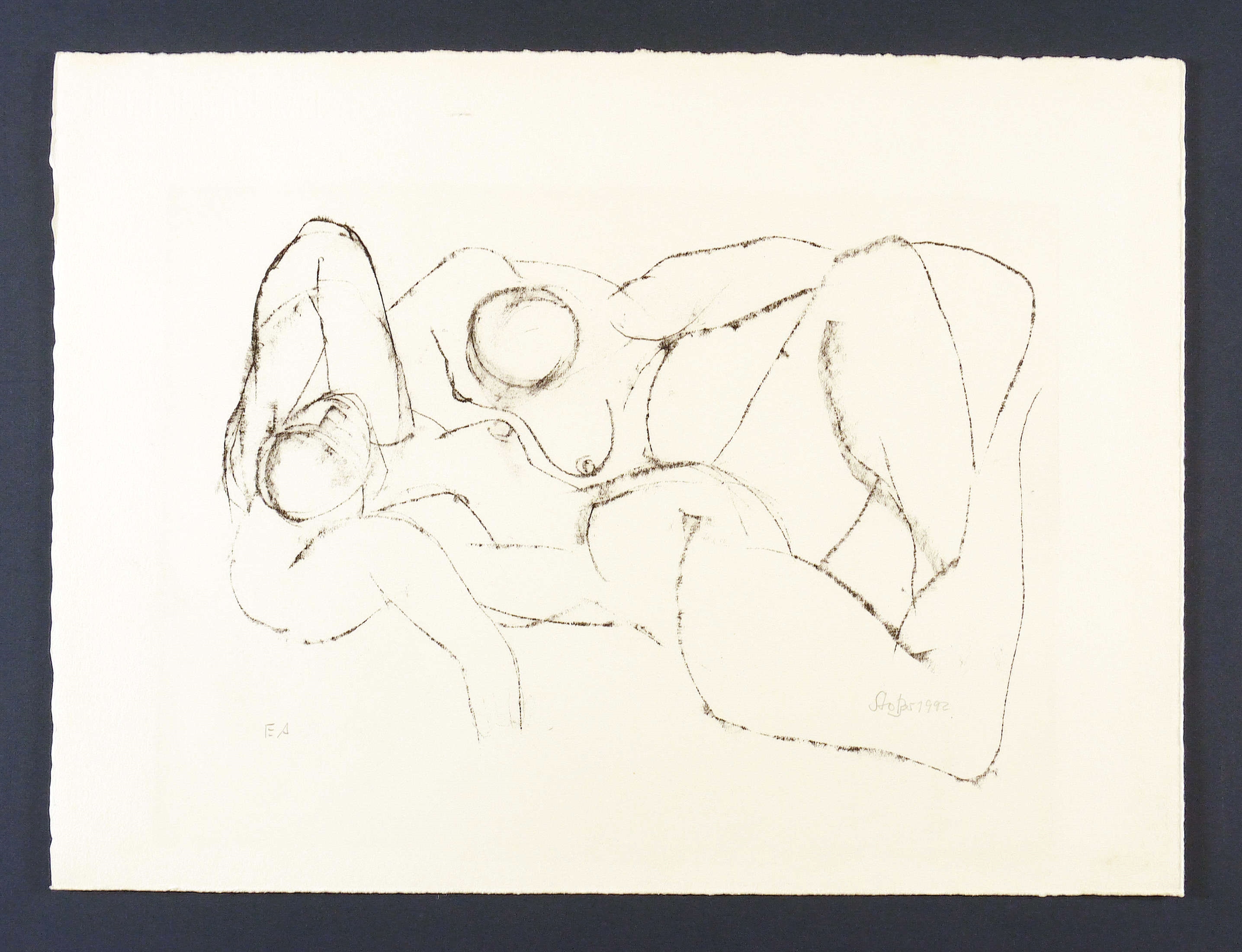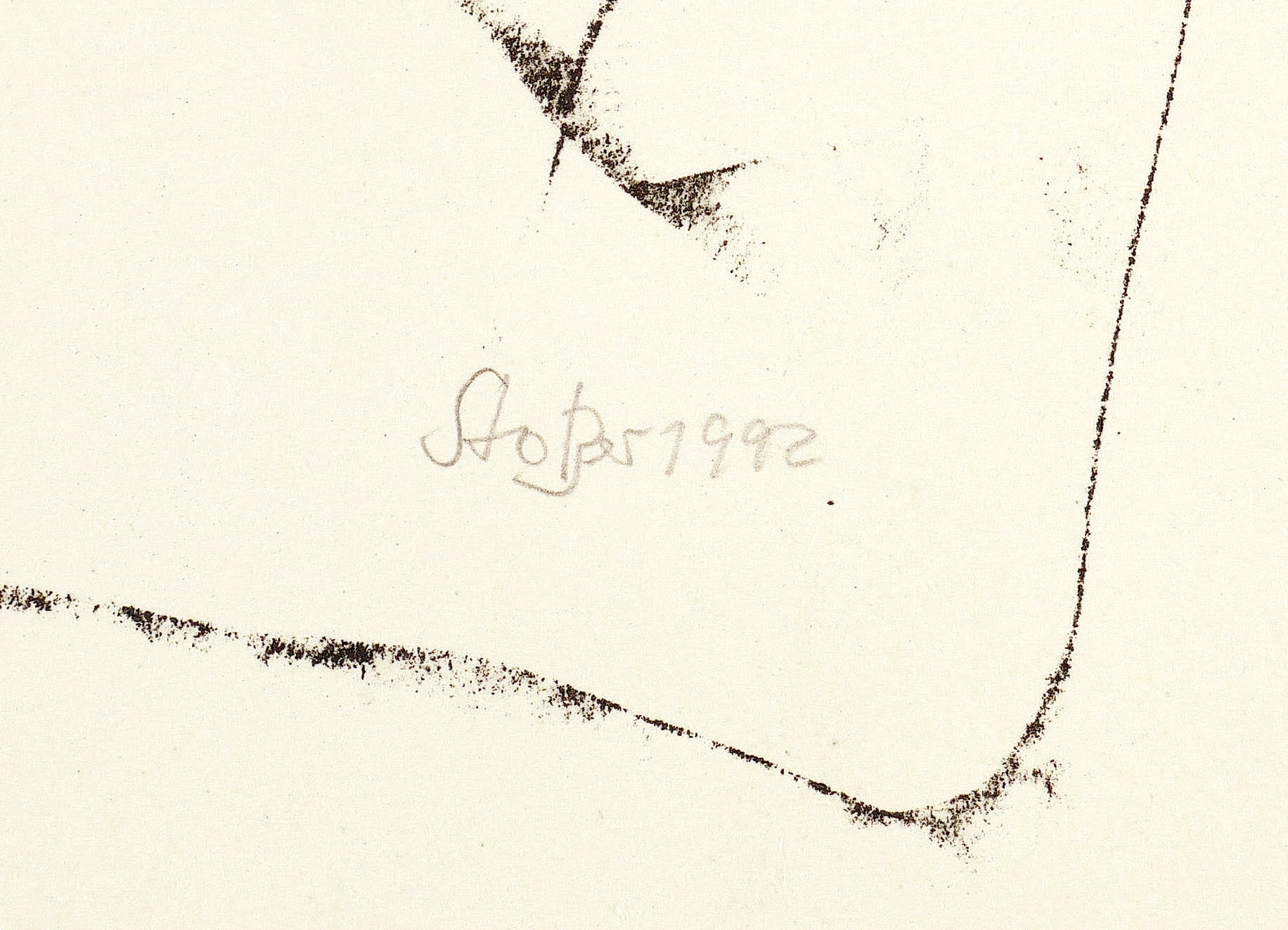 1992. Lithografie / Kreidelithografie, in Schwarz, auf schwerem hellchamois Hahnemühle-Bütten. – Originale Künstlergrafik, von Werner Stötzer. – Künstlerexemplar (e.a.). – 26,6 x 39,5 cm (Darstellung / Druckbild), 40 x 54 cm (Blatt).