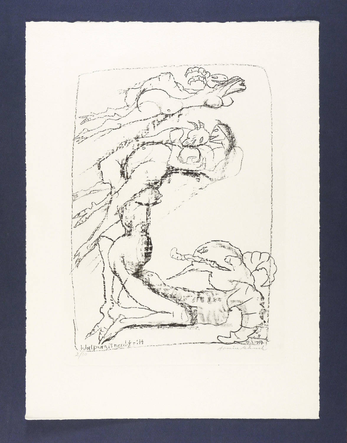 Aus: Armin Münch, Faustmephisto (Weimar: Galerie Profil 1999). – Rechts unten in Bleistift signiert. Links Auflagenbezeichnung. Im Stein links unten zusätzlich betitelt sowie rechts signiert und datiert. – Sehr guter Zustand.