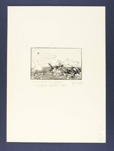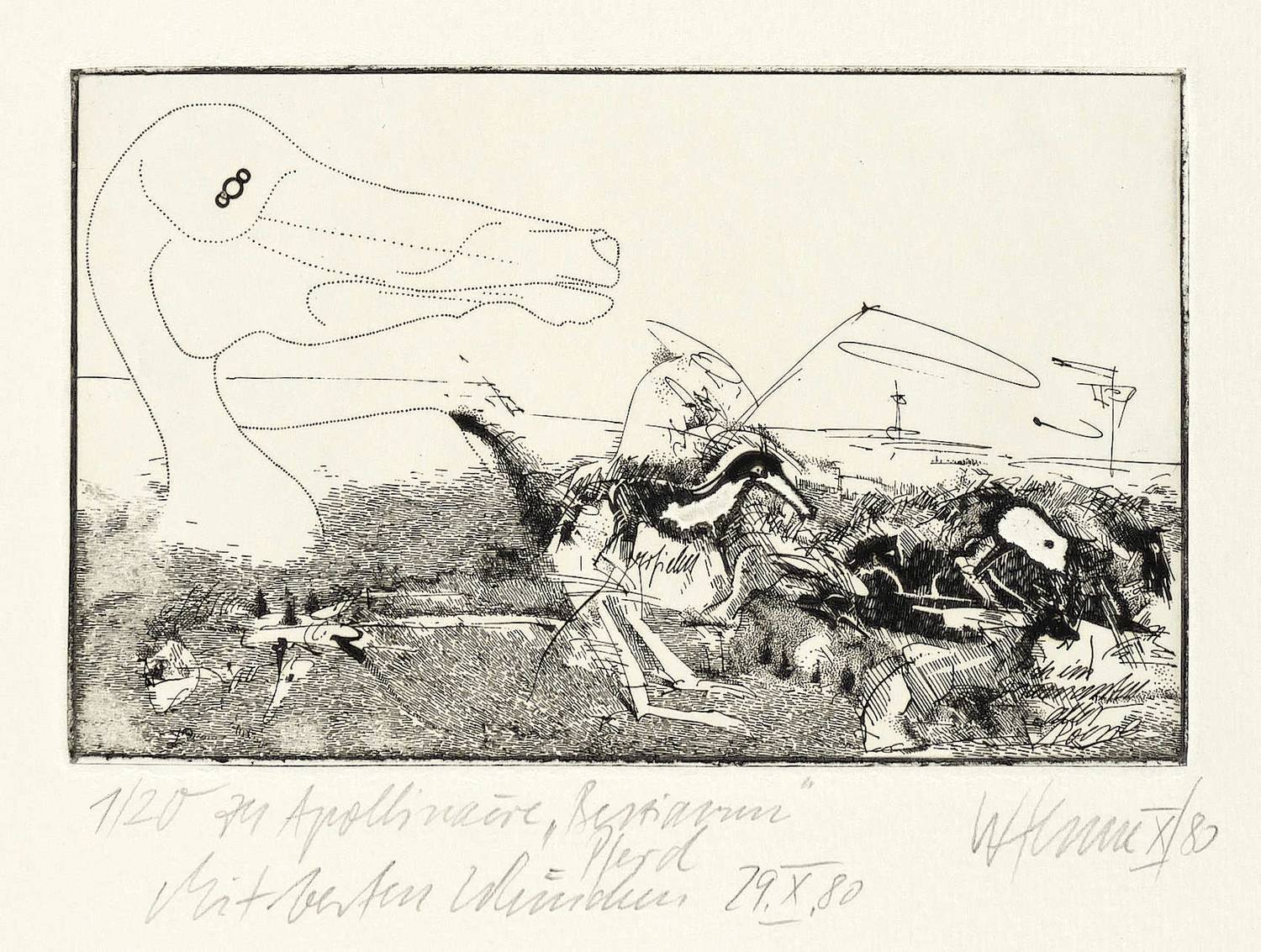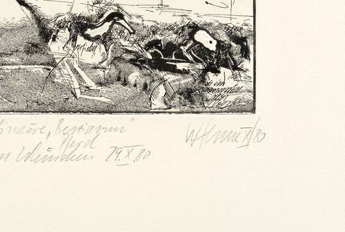 1980. Radierung / Strichätzung, in Schwarz, mit Prägerelief, auf Büttenkarton. – Originale Künstlergrafik, von Wolfgang Henne. – Auflage Exemplar Nr. 1/20. – 11,2 x 17,8 cm (Darstellung / Platte), 47,5 x 34,5 cm (Blatt).