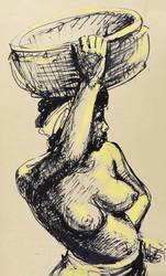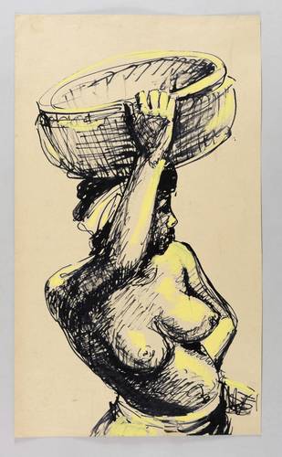1950-1960. Zeichnung / Pinselzeichnung, in schwarzer Tusche, gelb koloriert, auf hellbraunem Karton. – Originale Künstlergrafik, von Christa Diez. – Unikat. – 50,0 x 29,5 cm (Darstellung / Blatt).