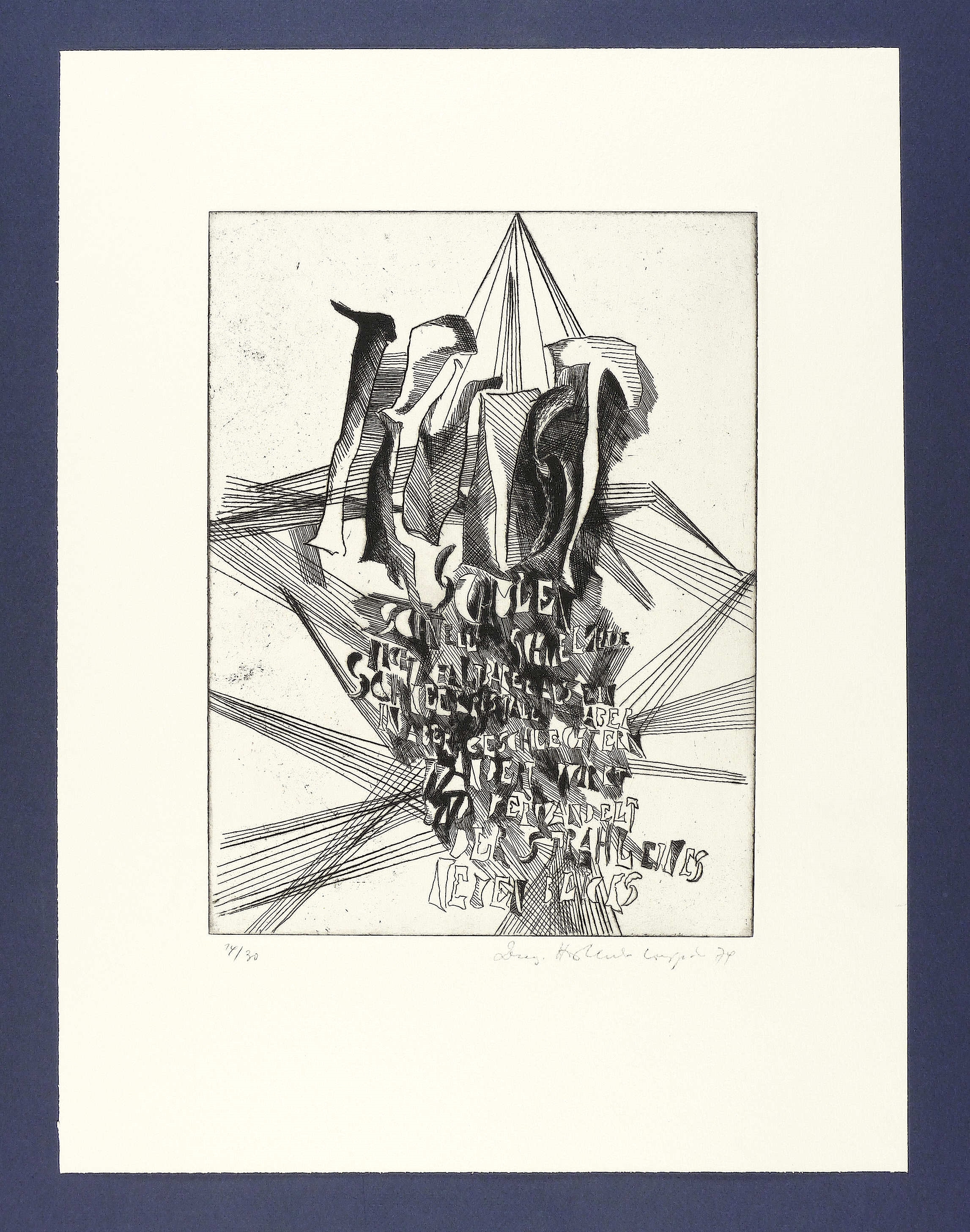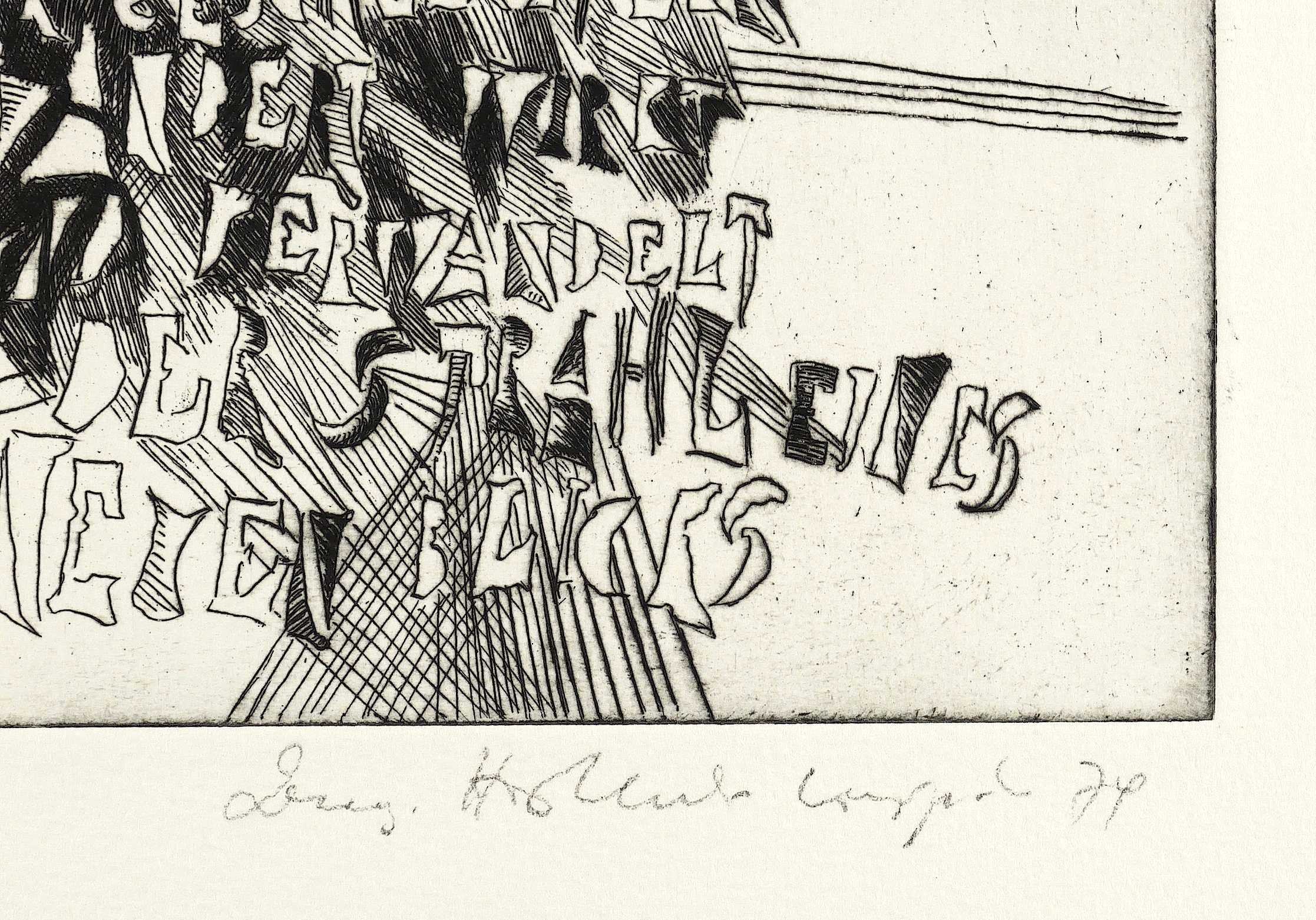 1974. Radierung / Strichätzung, in Schwarz, mit Plattenton, auf Kupferdruckkarton. – Von Irmgard Horlbeck-Kappler. – Auflage Exemplar Nr. 14/30. – 32,2 x 24,4 cm (Darstellung / Platte), 50 x 38 cm (Blatt).