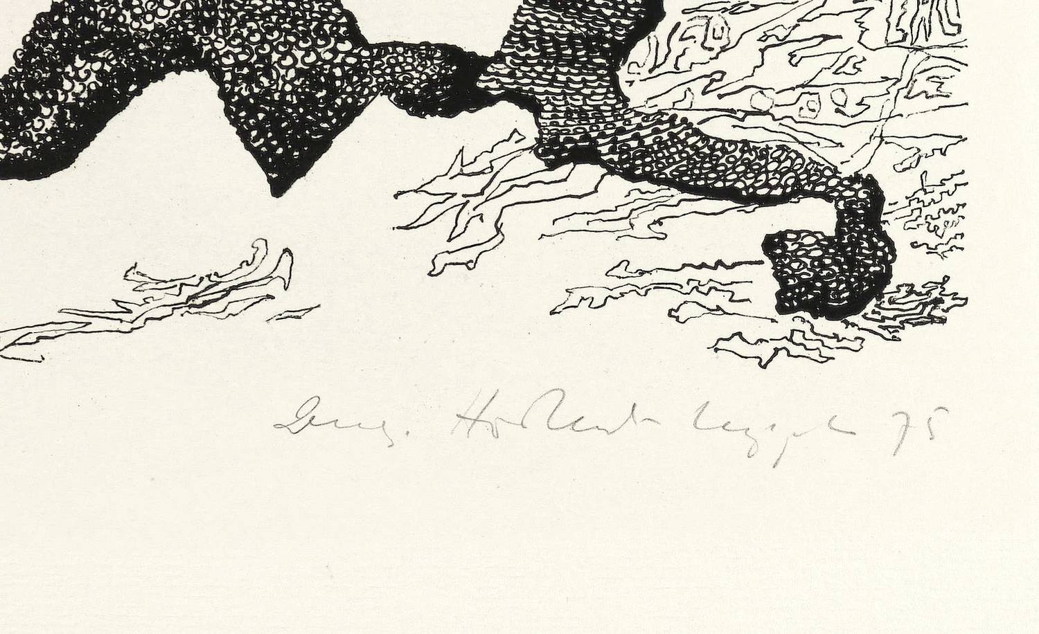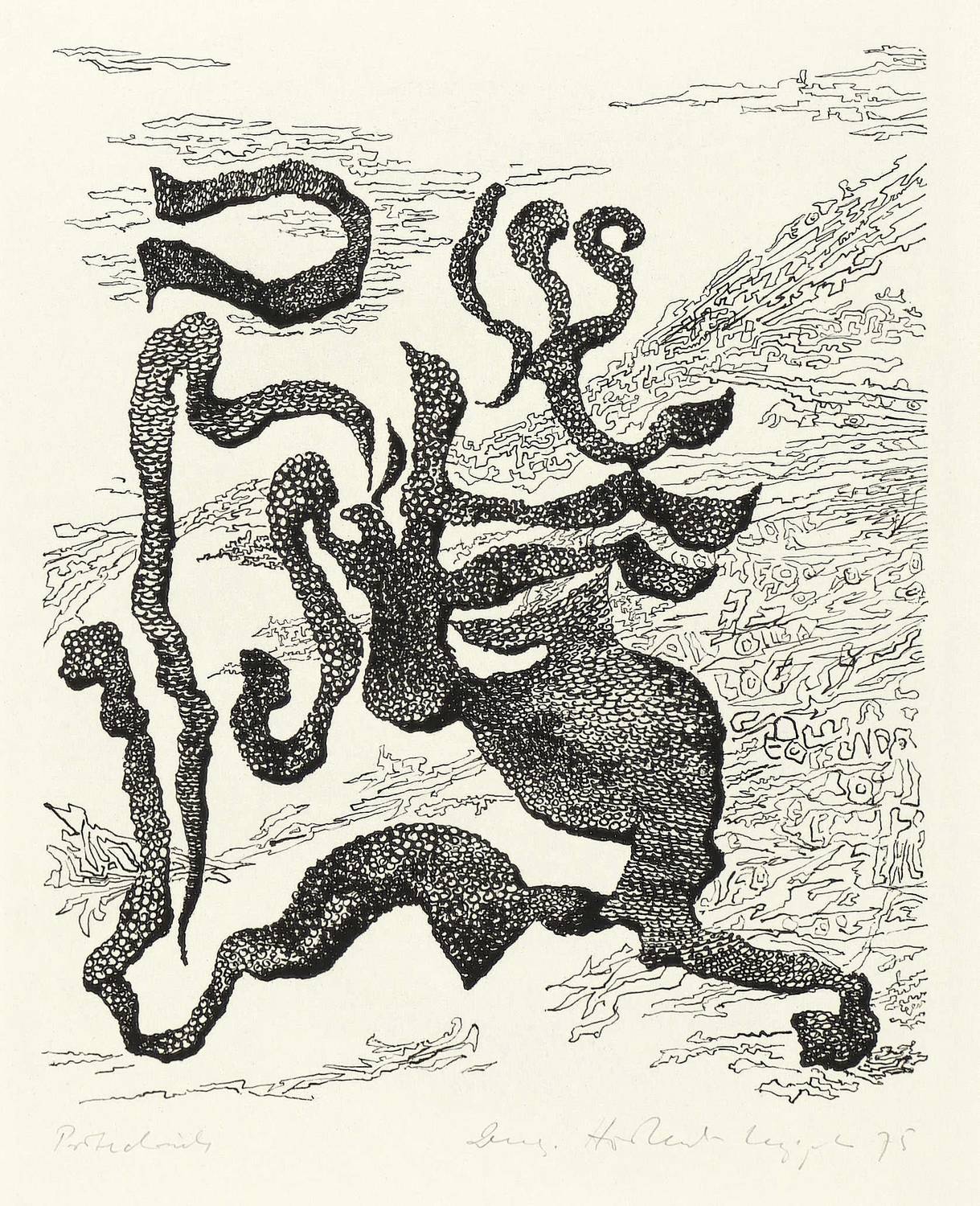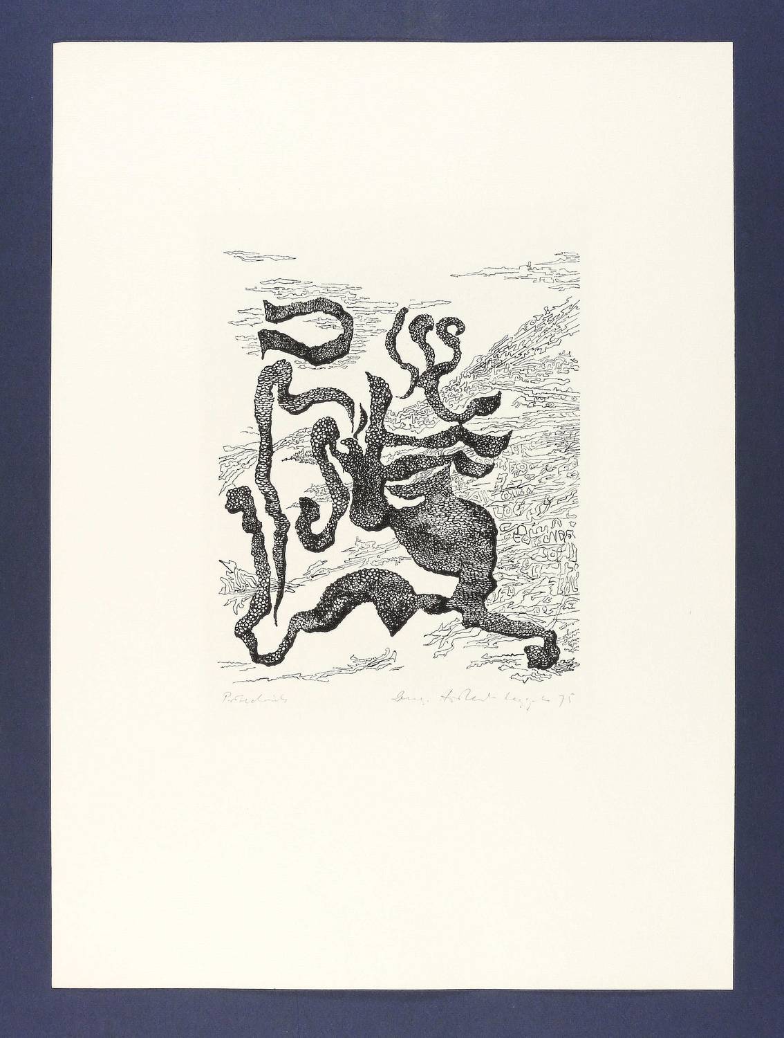1975. Lithografie / Federlithografie, in Schwarz, auf hellgelbem Weißenborn-Bütten. – Von Irmgard Horlbeck-Kappler. – Probedruck. – 24,7 x 20,7 cm (Darstellung / Platte), 54,5 x 39 cm (Blatt).