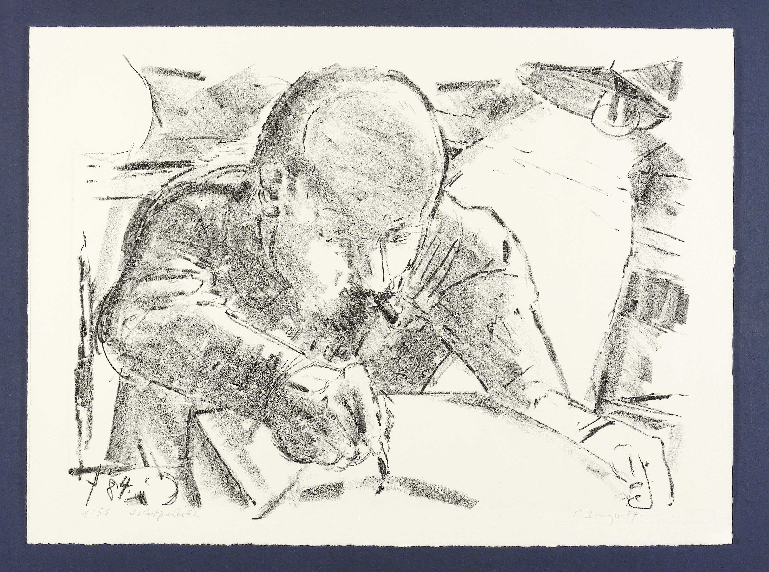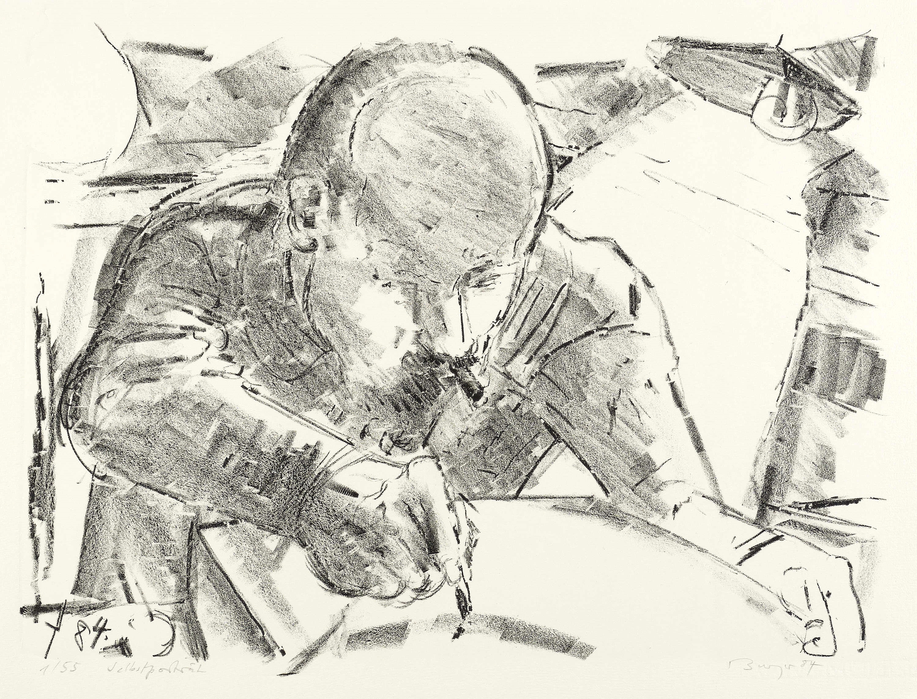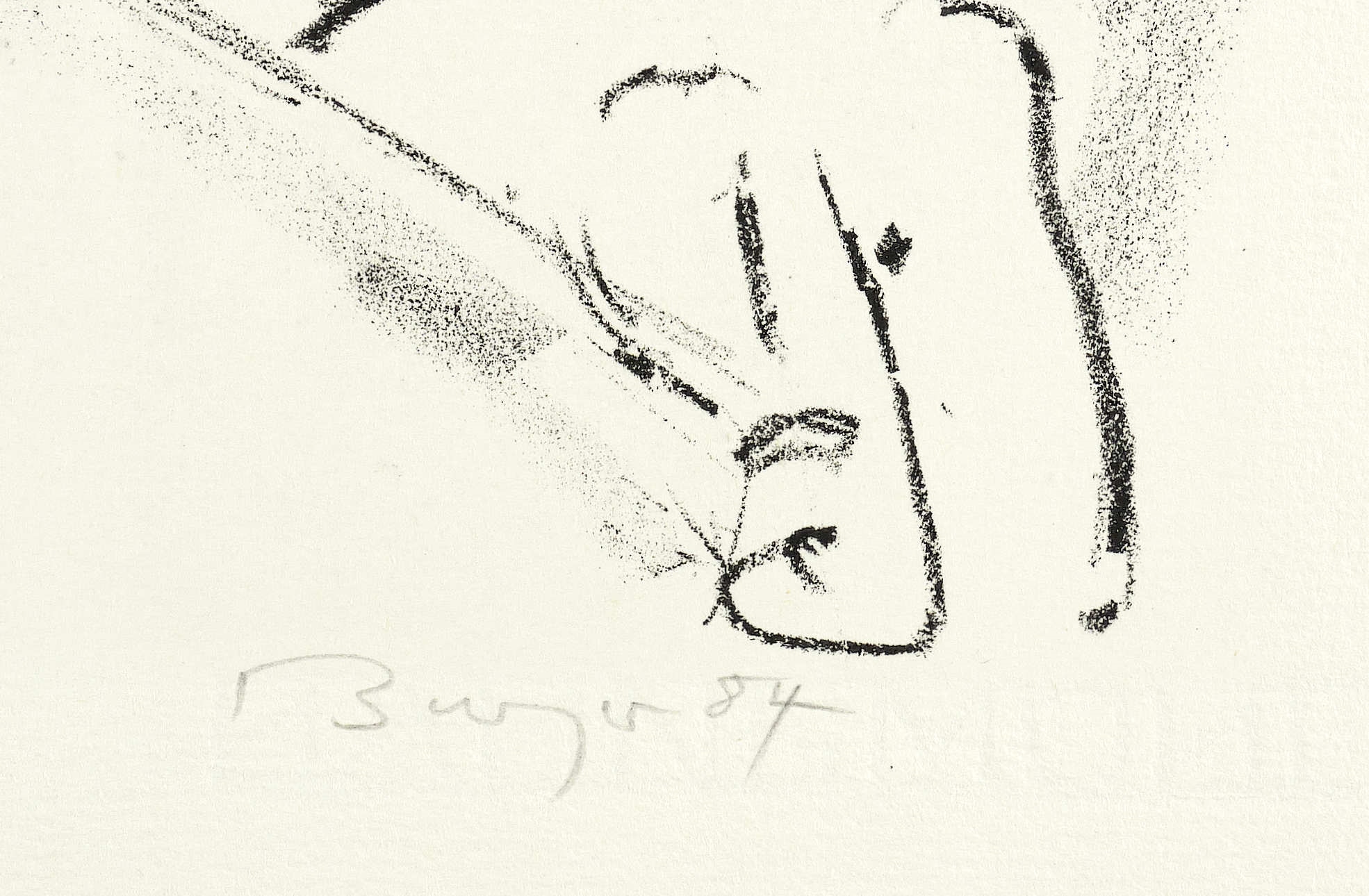1984. Lithografie / Kreidelithografie, in Schwarz, auf Hahnemühle-Bütten. – Von Dietrich Burger. – Auflage Exemplar Nr. 1/55. – 35,4 x 47,3 cm (Darstellung), 40 x 54 cm (Blatt).