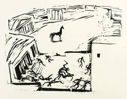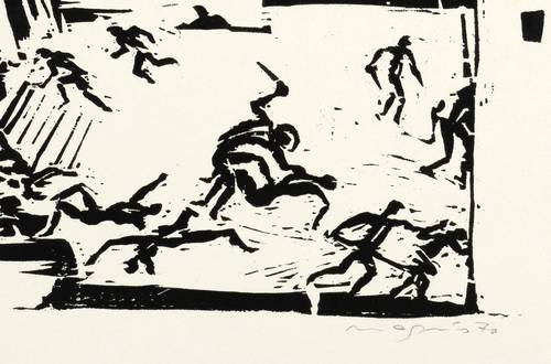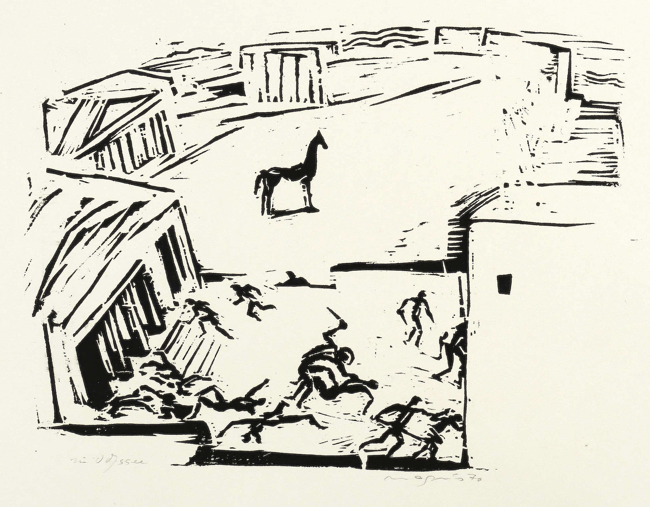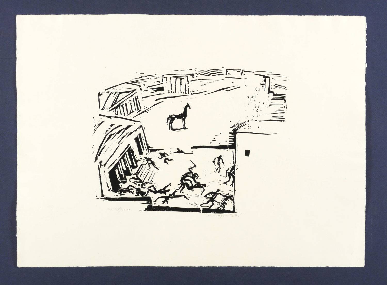1976. Holzschnitt, in Schwarz, auf hellgelbem Büttenpapier. – Originale Künstlergrafik, von Klaus Magnus. – 17,7 x 23,4 cm (Darstellung / Druckbild), 30 x 42 cm (Blatt).