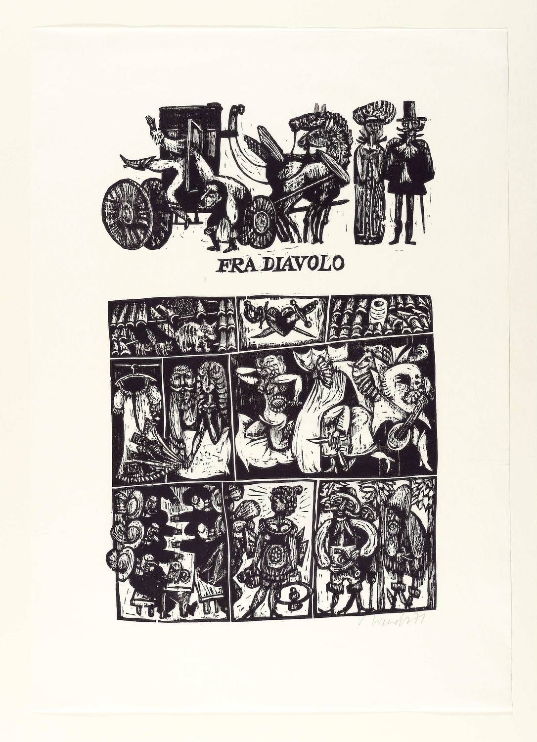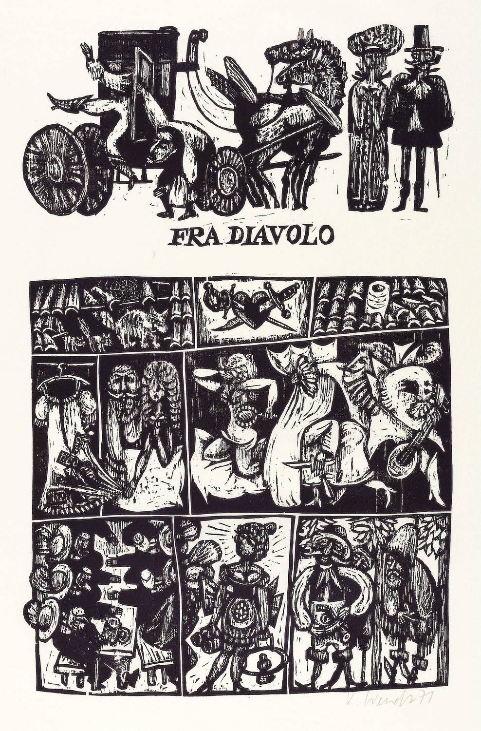Volker Wendt (1945 Leipzig - 2016 Leipzig). Deutscher Grafiker und Illustrator. 1962-64 Lehre als Schriftsetzer in Gardelegen. 1964-66 Studium der Germanistik und Kunsterziehung am Pädagogischen Institut Dresden. 1966-71 Studium der Buchgestaltung/Gebrauchsgrafik an der HGB Leipzig. 1971-77 Tätigkeit an den Leipziger Theatern, anfangs als Werbeleiter, später nur noch als Grafiker, Illustrator und Gestalter auch für andere Theater und Verlage. Seit 1977 Lehrbeauftragter, später künstlerischer Mitarbeiter an der HGB Leipzig. Seit 1991 Leiter der Abendakademie.
