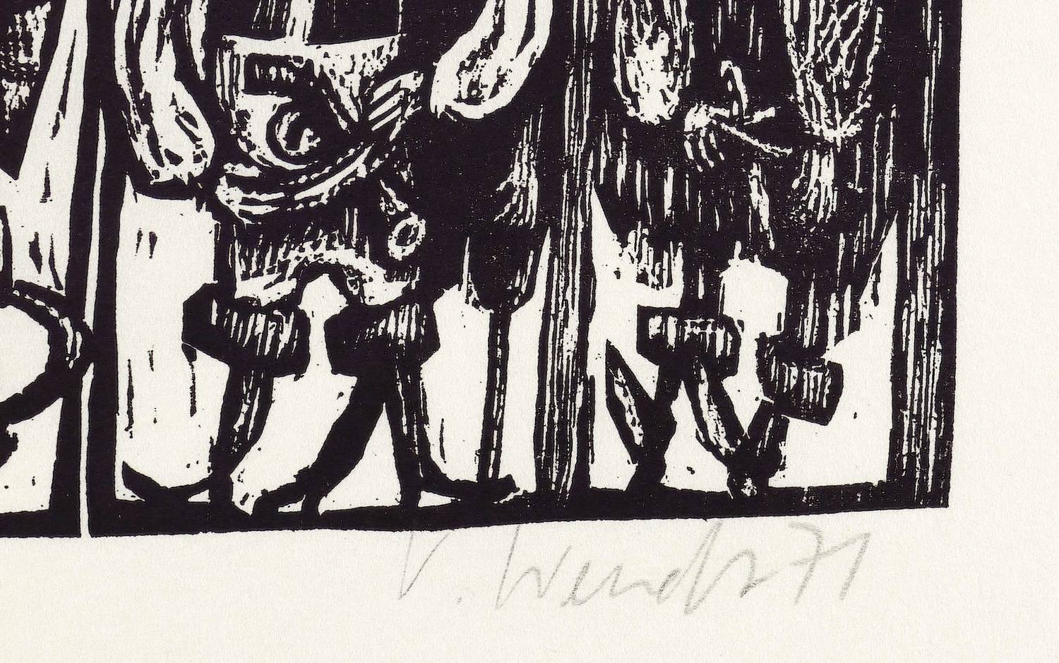 1971. Holzschnitt, in Schwarz, auf rauem weißlichem Japan. – Originale Künstlergrafik, von Volker Wendt. – 44,0 x 28,0 cm (Darstellung / Druckstock), 58 x 41 cm (Blatt).