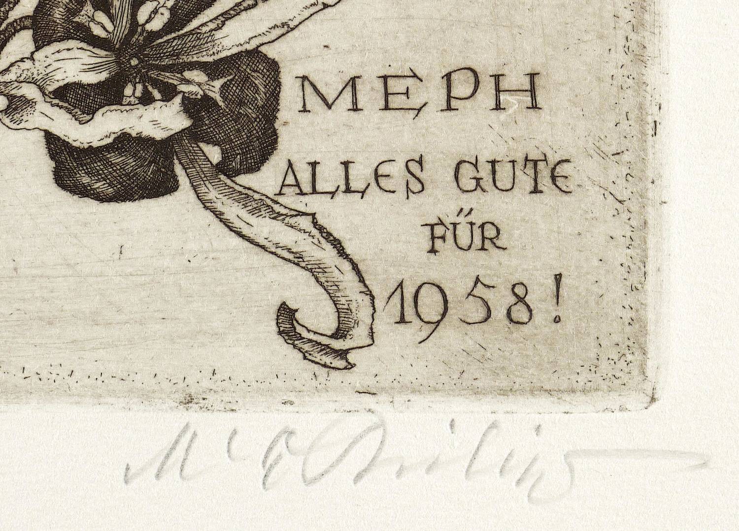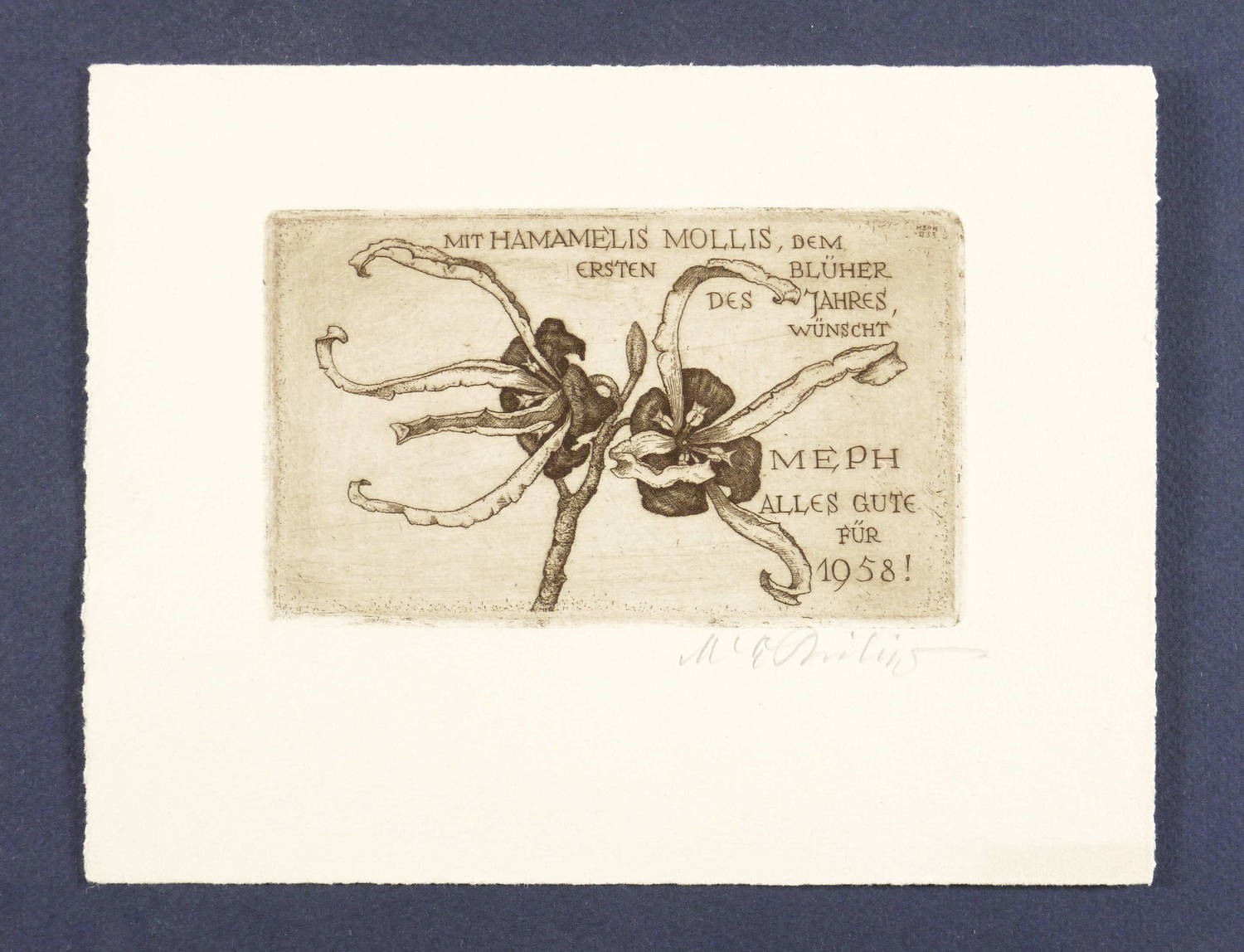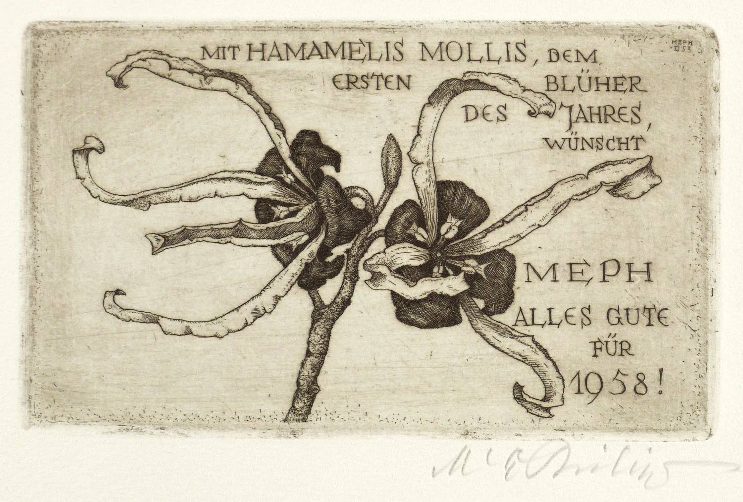 Nicht bei Götze. – Rechts unten in Bleistift signiert. In der Platte Inschrift, Monogramm und Glückwunsch: ″MIT HAMAMELIS MOLLIS, DEM ERSTEN BLÜHER DES JAHRES, WÜNSCHT MEPH ALLES GUTE FÜR 1958″. – Sehr schön erhalten.