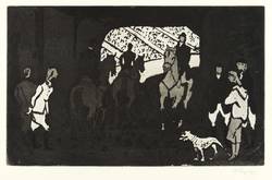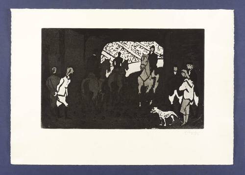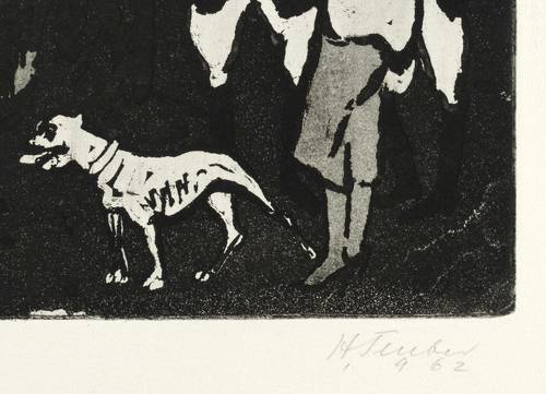 1962. Radierung / Aquatinta, in Schwarz, auf hellgelbem Büttenkarton. – Originale Künstlergrafik, von Hermann Teuber. – 24,7 x 39,7 cm (Darstellung / Platte), 38 x 54 cm (Blatt).