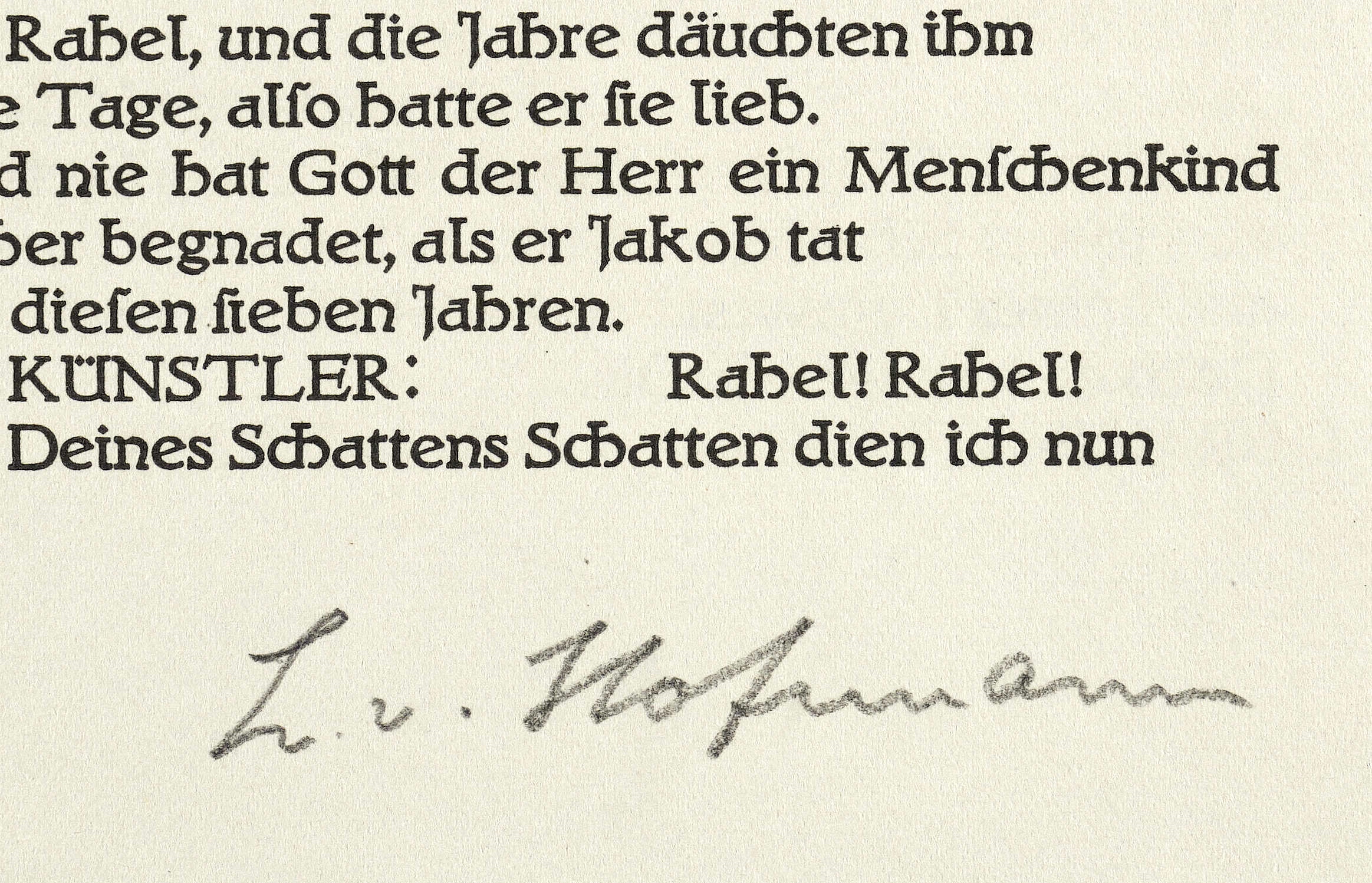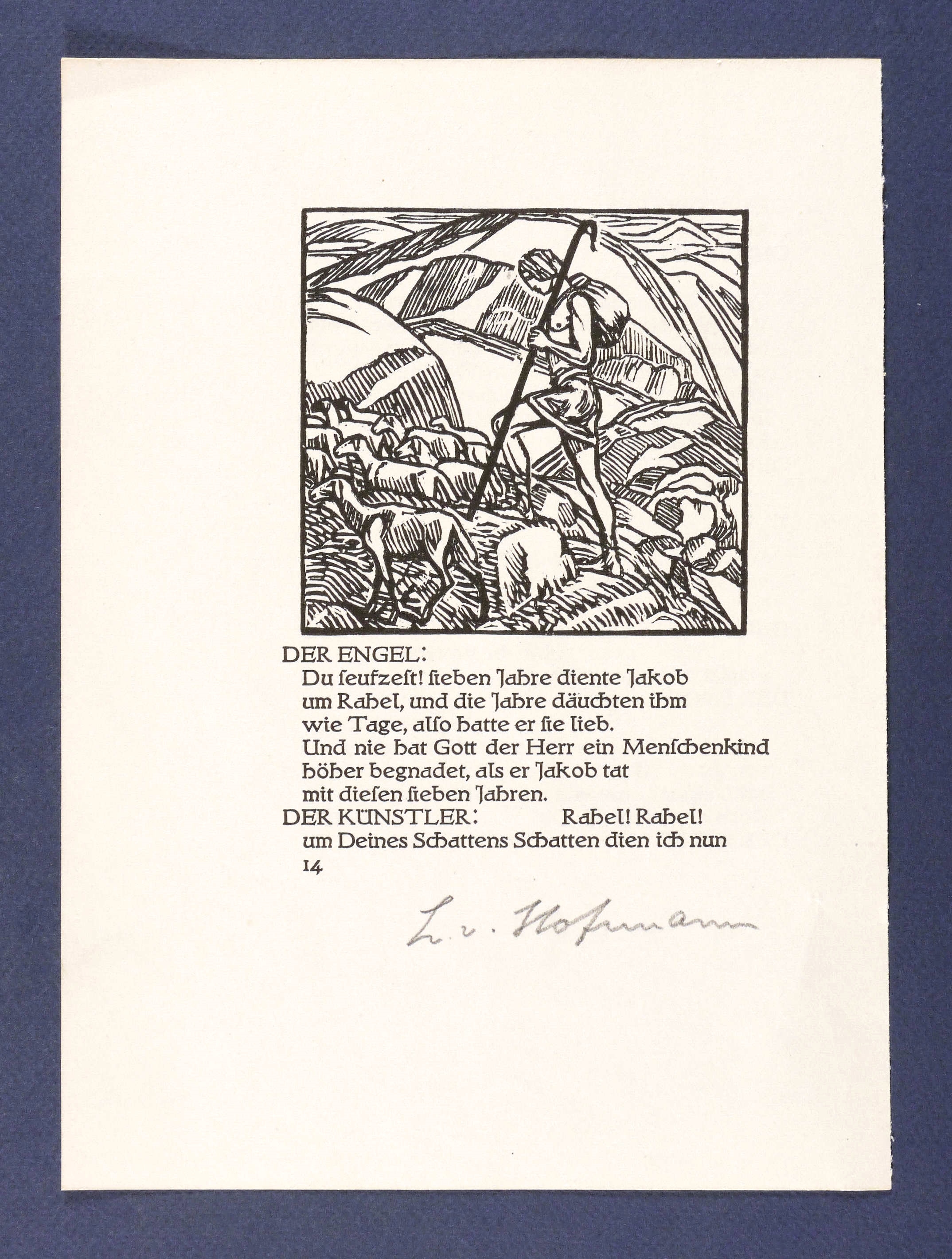 Unterhalb in Bleistift signiert: ″L. v. Hofmann″. Dazu unterhalb und verso typografischer Text. – Leichte Knickspur rechts unten im Rand. Guter Zustand.