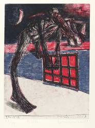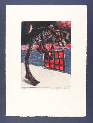 1989. Farbradierung / Strichätzung & Vernis mou, in 3 Farben, auf Hahnemühle-Bütten. – Originale Künstlergrafik, von Steffen Volmer. – Auflage Exemplar Nr. 49/50. – 33,3 x 24,6 cm (Darstellung / Platte), 54 x 40 cm (Blatt).