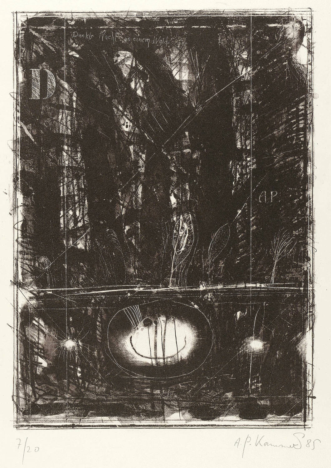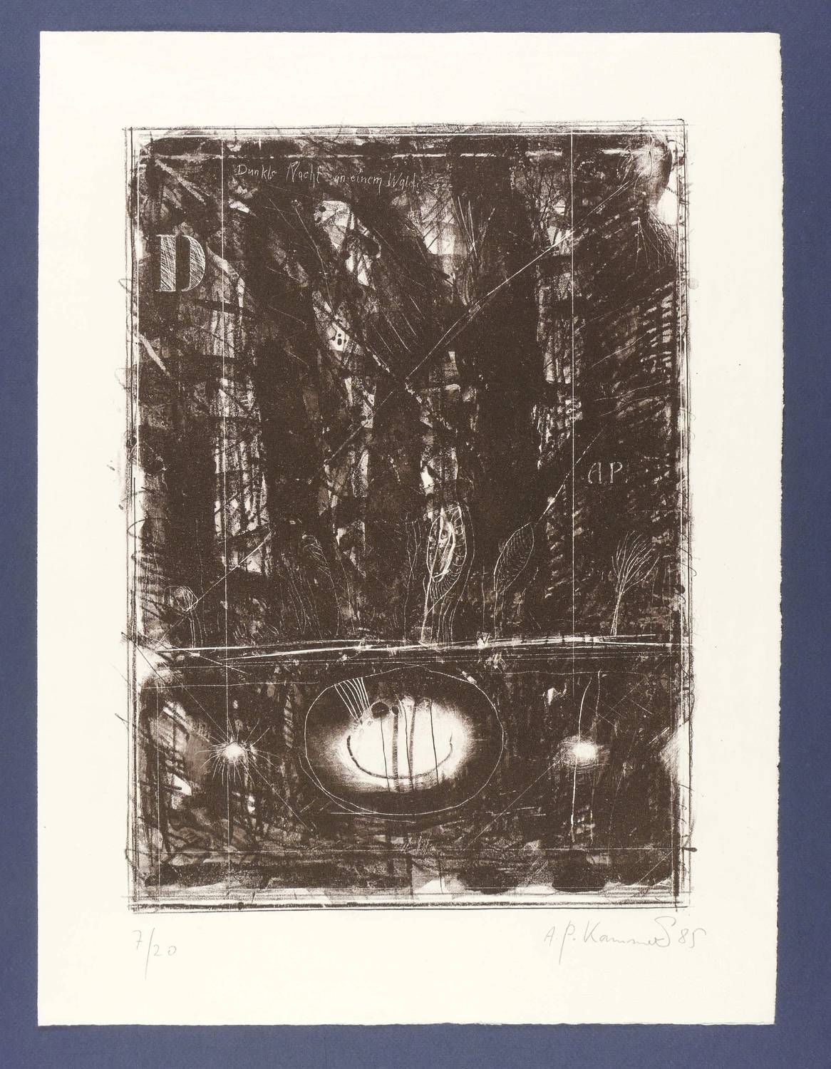 1985. Lithografie / Kreide- & Pinsellithografie, partiell geschabt, in Schwarz, auf hellgelbem Büttenpapier. – Originale Künstlergrafik, von Anton Paul Kammerer. – Auflage Exemplar Nr. 7/20. – 41,7 x 31,0 cm (Darstellung / Druckbild), 52,5 x 39,5 cm (Blatt).