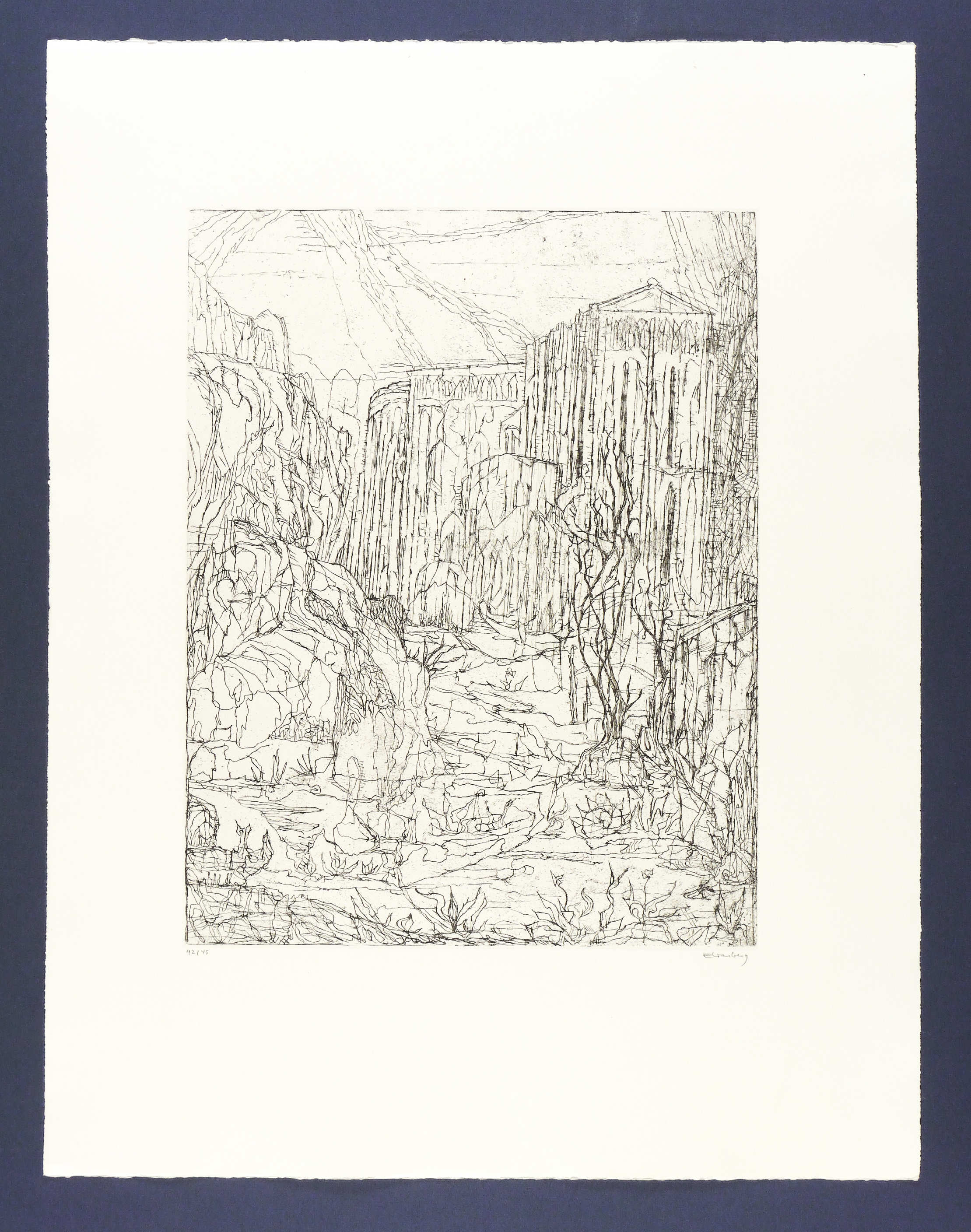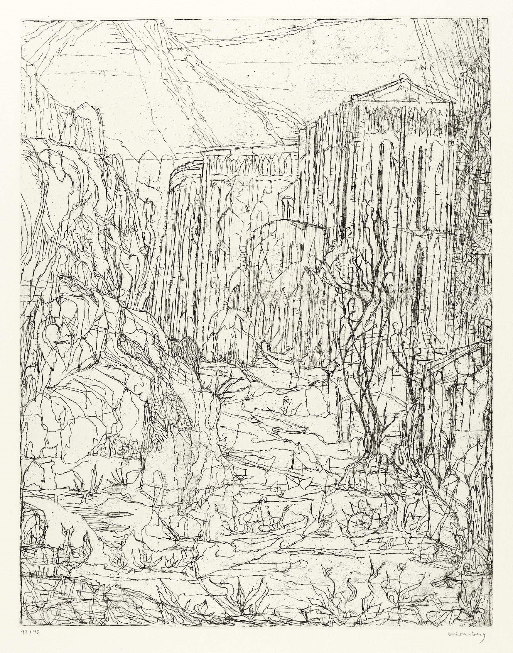1968. Radierung / Strichätzung, in Schwarz, auf BFK-Rives-Bütten. – Originale Künstlergrafik, von Paul Eliasberg. – Auflage Exemplar Nr. 42/45. – 42,4 x 33,0 cm (Darstellung / Platte), 65 x 50 cm (Blatt).