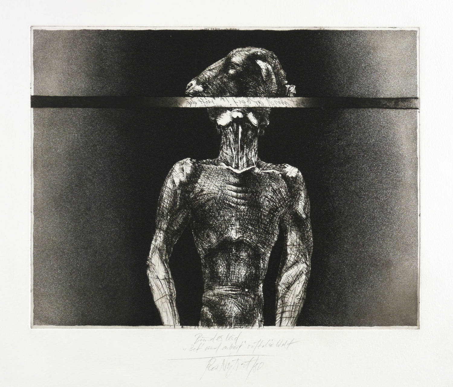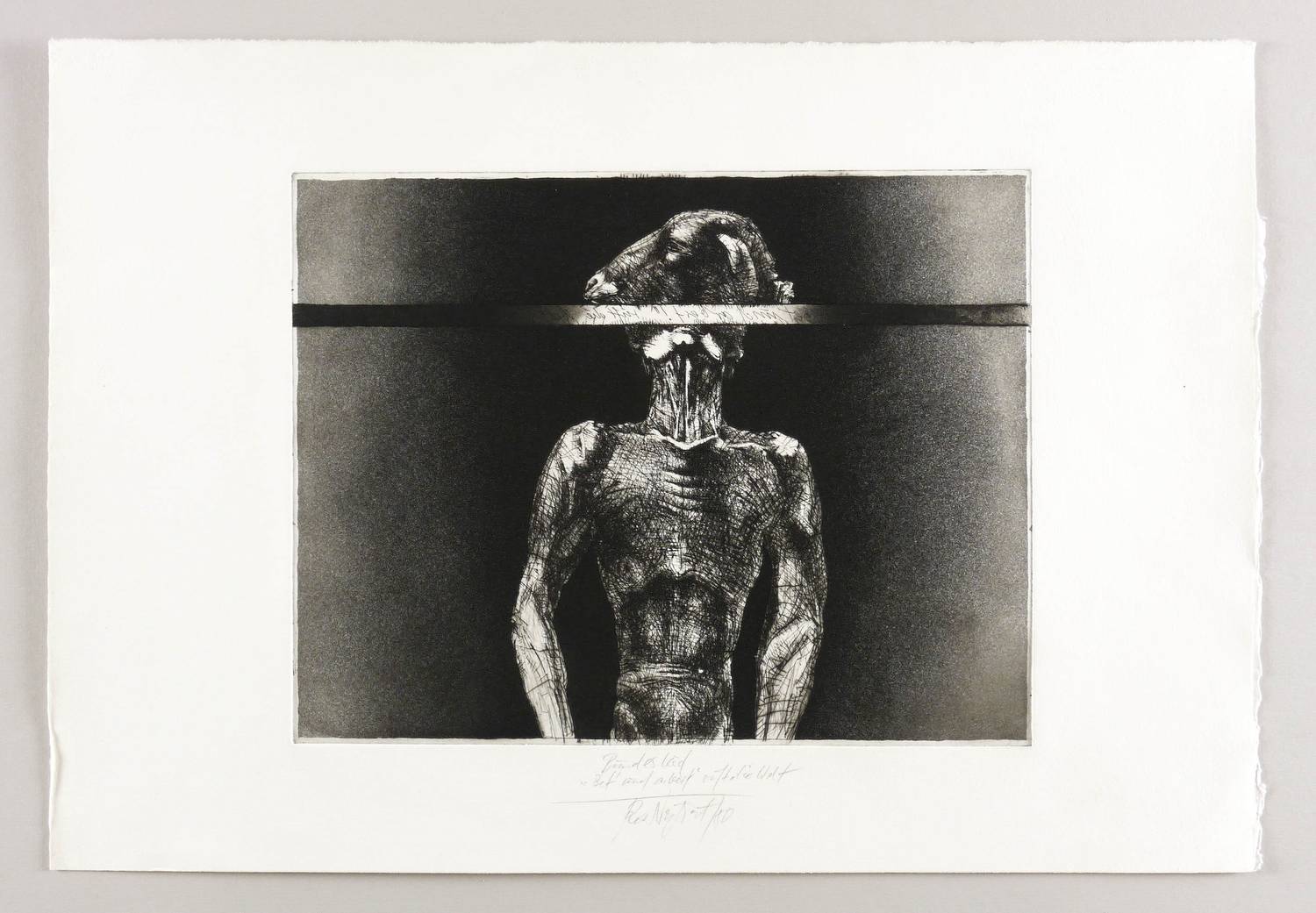 1980. Radierung / Aquatinta, Strichätzung & Kaltnadel, in Schwarz, auf schwerem hellchamois Velin. – Originale Künstlergrafik, von Frank Ruddigkeit. – Probedruck. – 26,7 x 34,4 cm (Darstellung / Platte), 39 x 57 cm (Blatt).