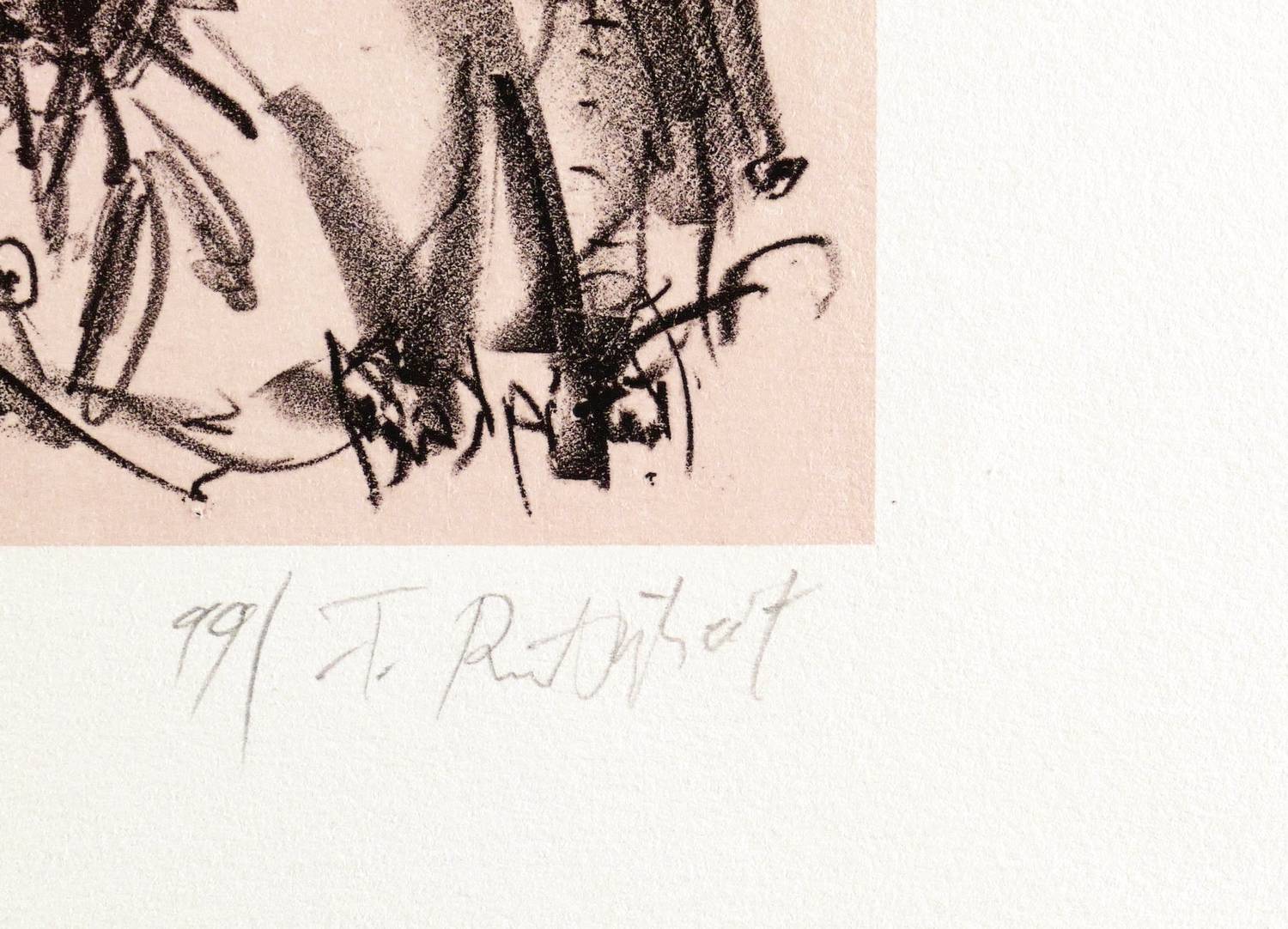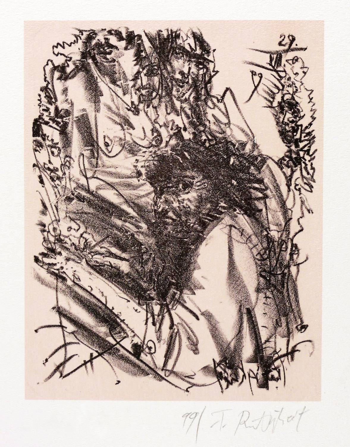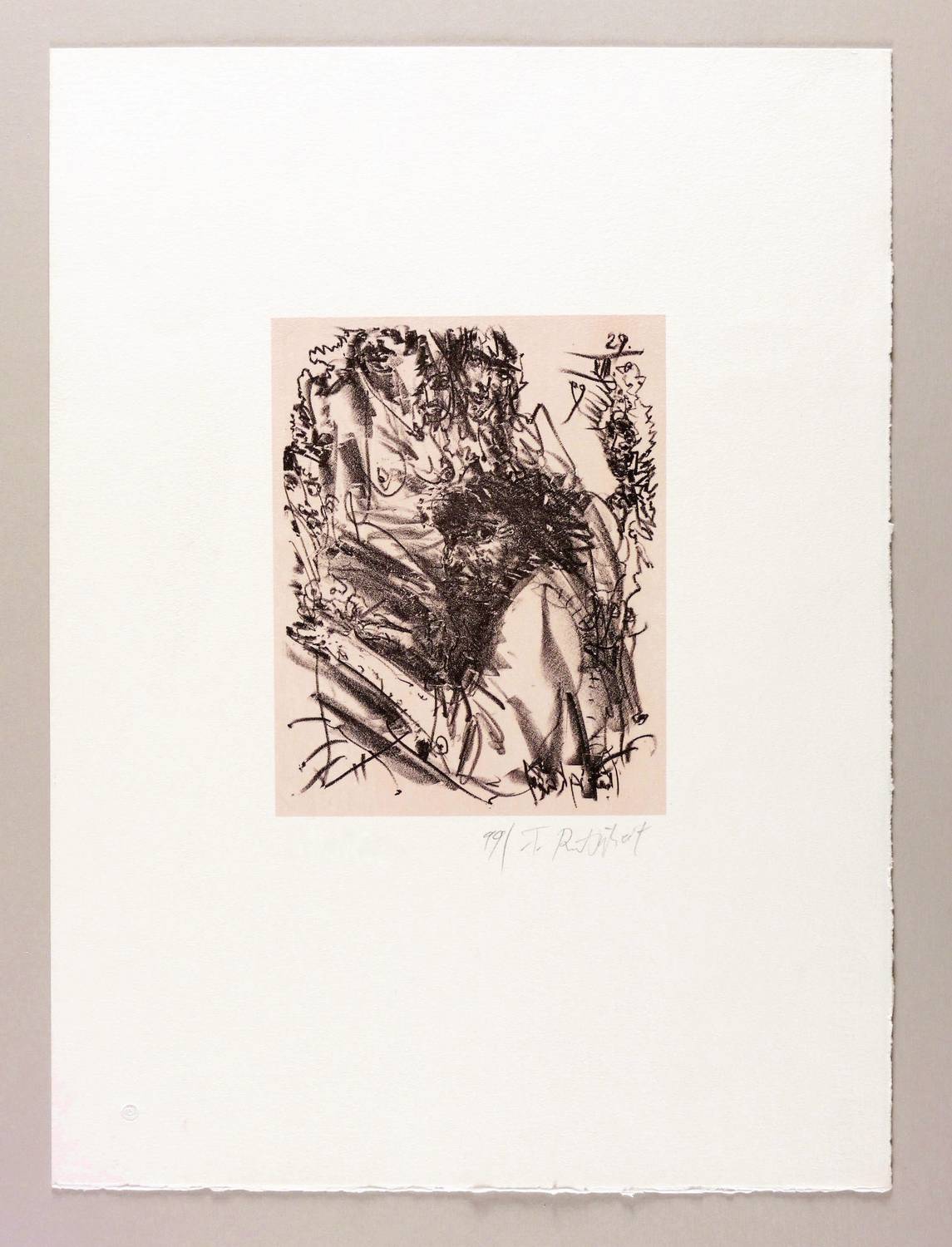 1999. Tonlithografie / Kreidelithografie, in Schwarz, über hellroter Tonplatte, auf Hahnemühle-Bütten. – Von Frank Ruddigkeit. – 22,9 x 17,7 cm (Darstellung / Druckbild), 23,6 x 18,7 cm (Tonplatte), 54 x 40 cm (Blatt).