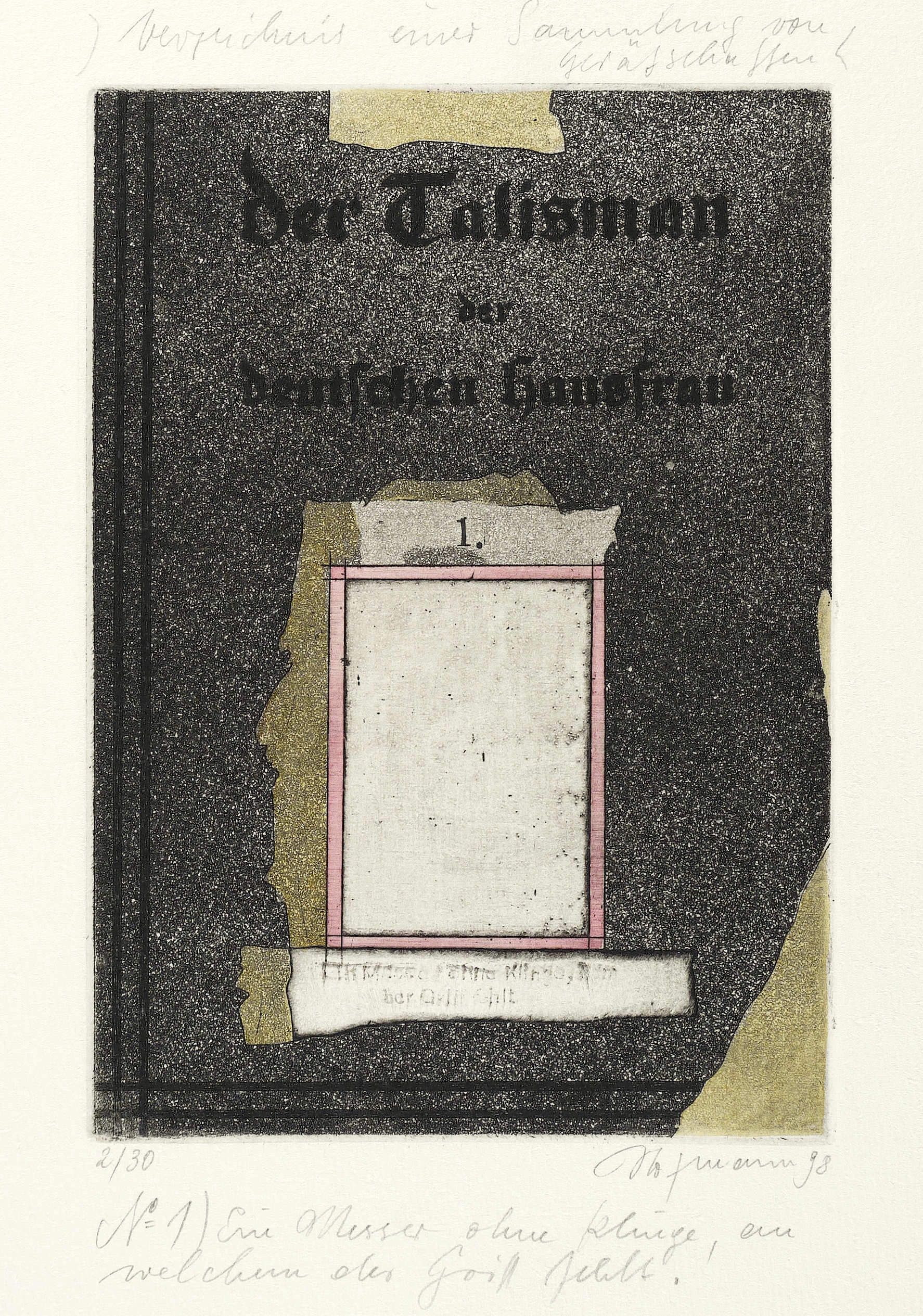 Rechts unten in Bleistift signiert und datiert. Links Auflagenbezeichnung. Oberhalb Serien-Titel. Unterhalb Titel und ausführliche Bezeichnung. – Blatt aus dem Radier-Zyklus zu Georg Christoph Lichtenberg und seinem phantastisch-bizzaren ″Verzeichnis einer Sammlung von Geräthschaften, welche in dem Hause des Sir H.S. künftige Woche öffentlich verauctioniert werden sollen″ (1798). – Ohne Mangel. Sehr guter Zustand.