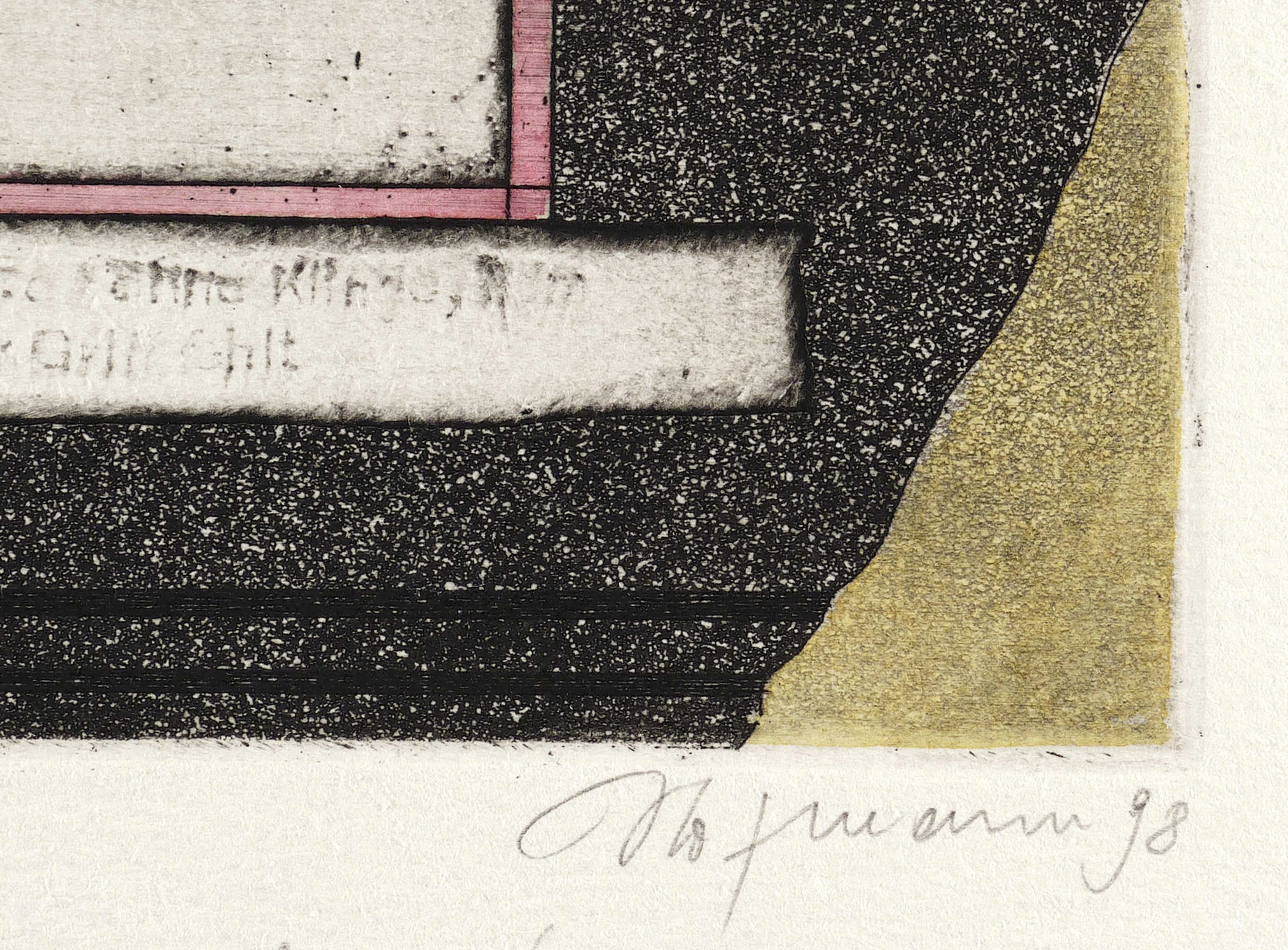 1998. Radierung / Aquatinta & Strichätzung, in Schwarz, aquarelliert, auf Büttenkarton. – Von Günter Hofmann. – Auflage Exemplar Nr. 2/30. – 16,7 x 11,9 cm (Darstellung / Platte), 26,5 x 19,5 cm (Blatt).