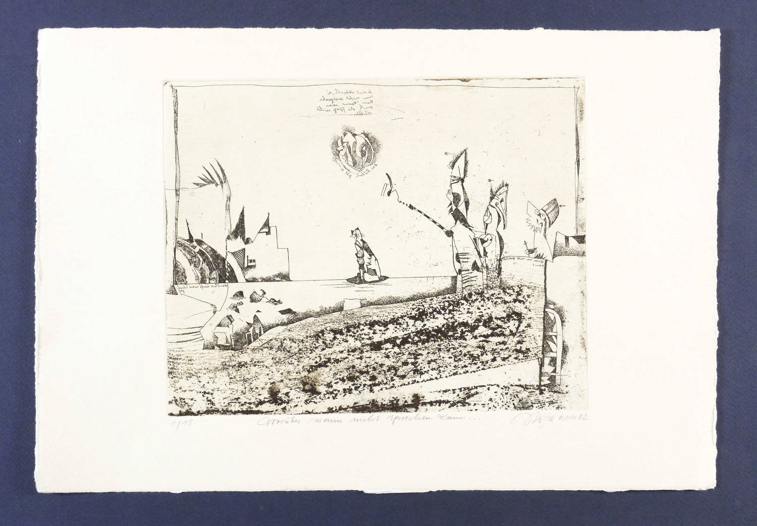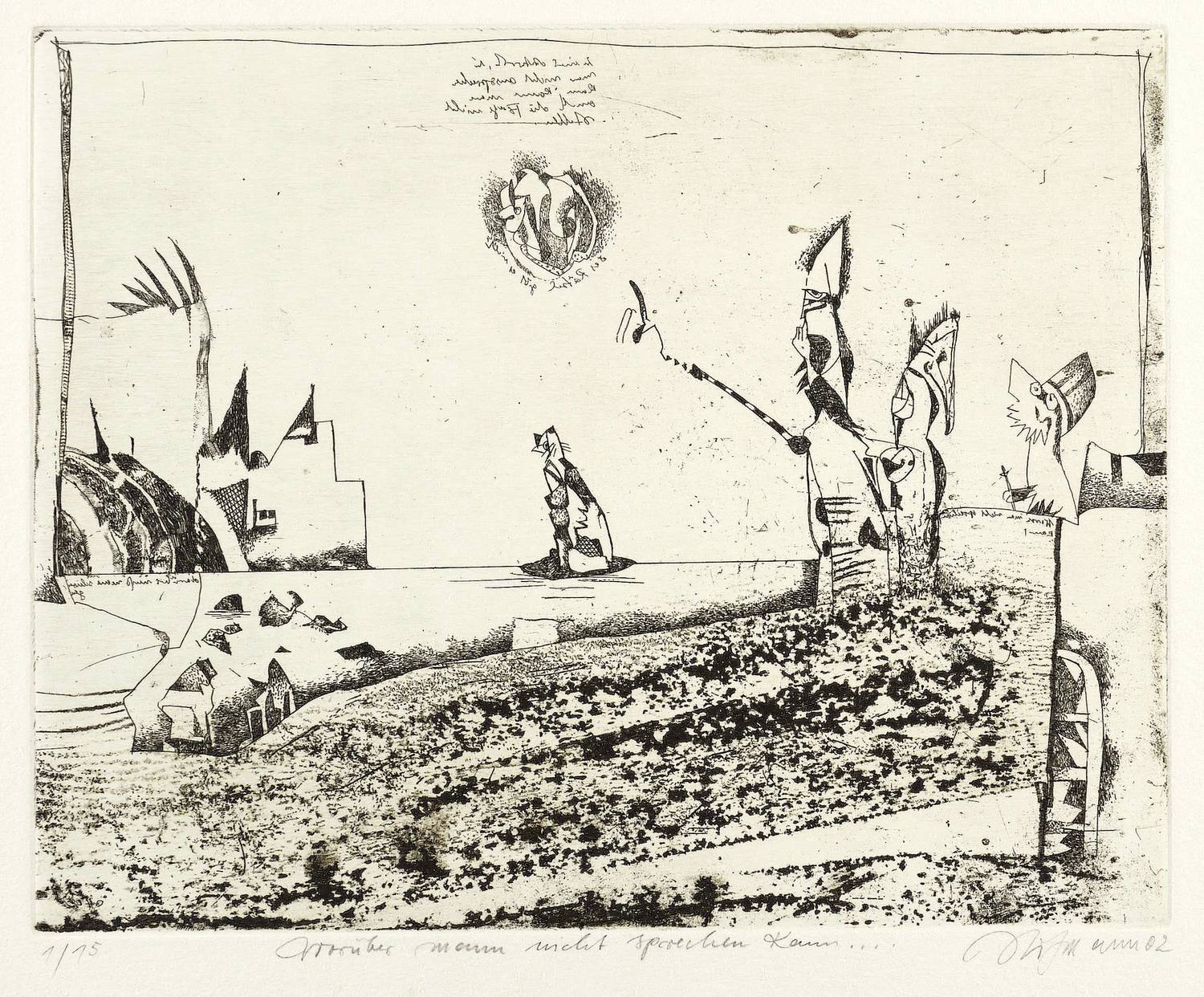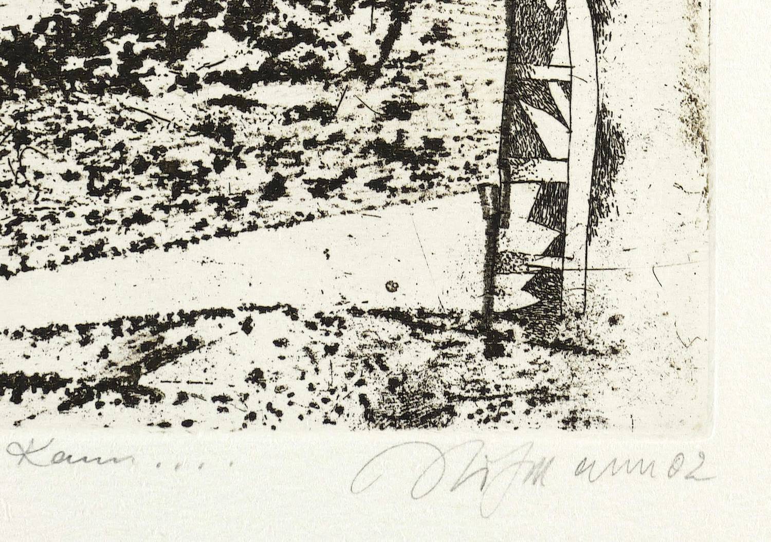 2002. Radierung / Strichätzung & Vernis mou, in Schwarz, auf hellchamois Büttenkarton. – Von Günter Hofmann. – Auflage Exemplar Nr. 1/15. – 19,6 x 24,5 cm (Darstellung / Platte), 27 x 40 cm (Blatt).