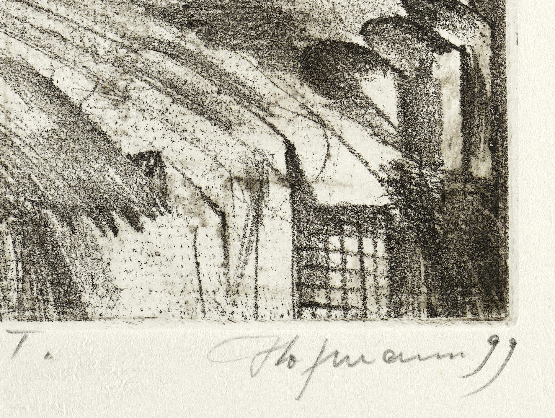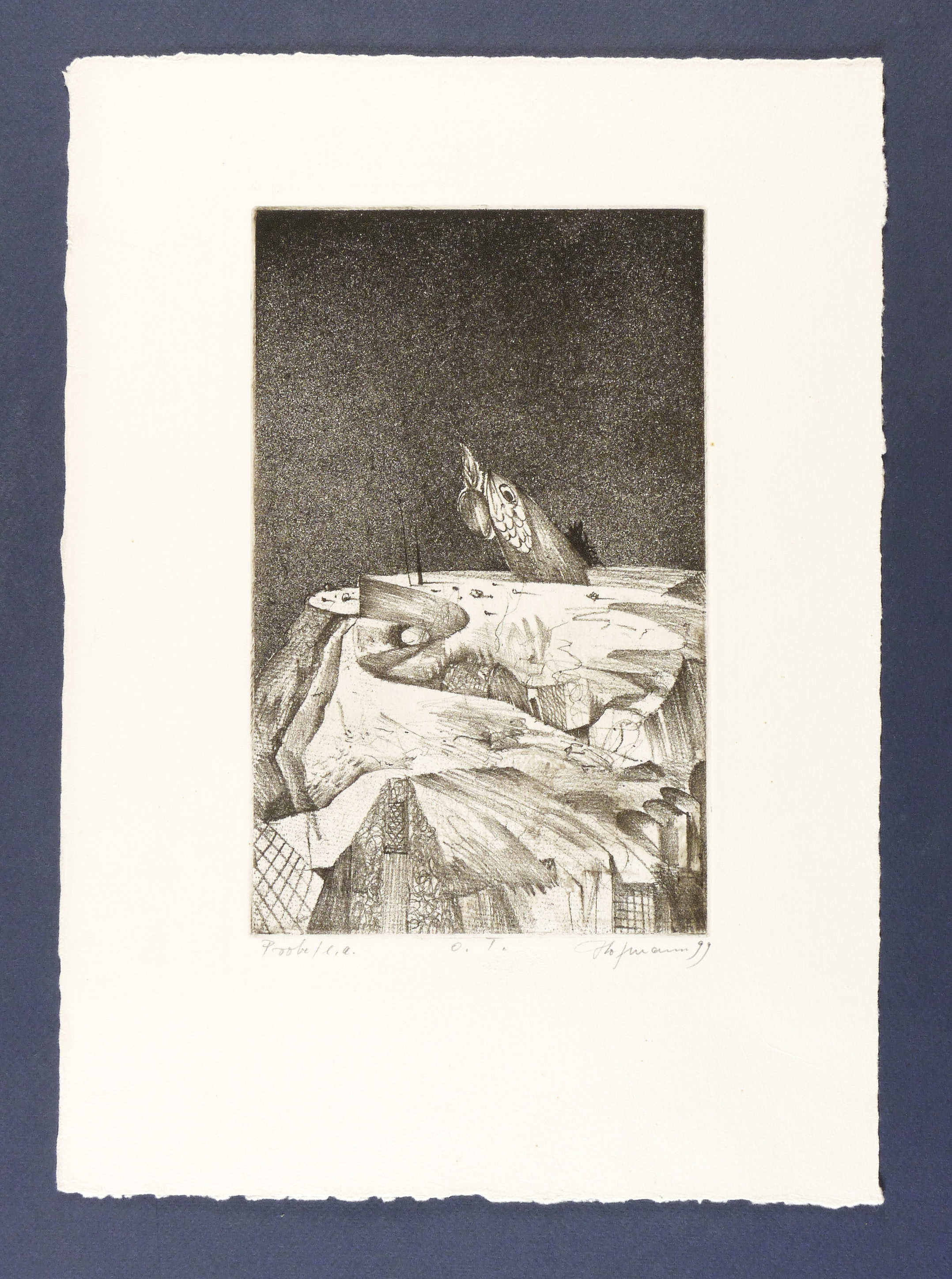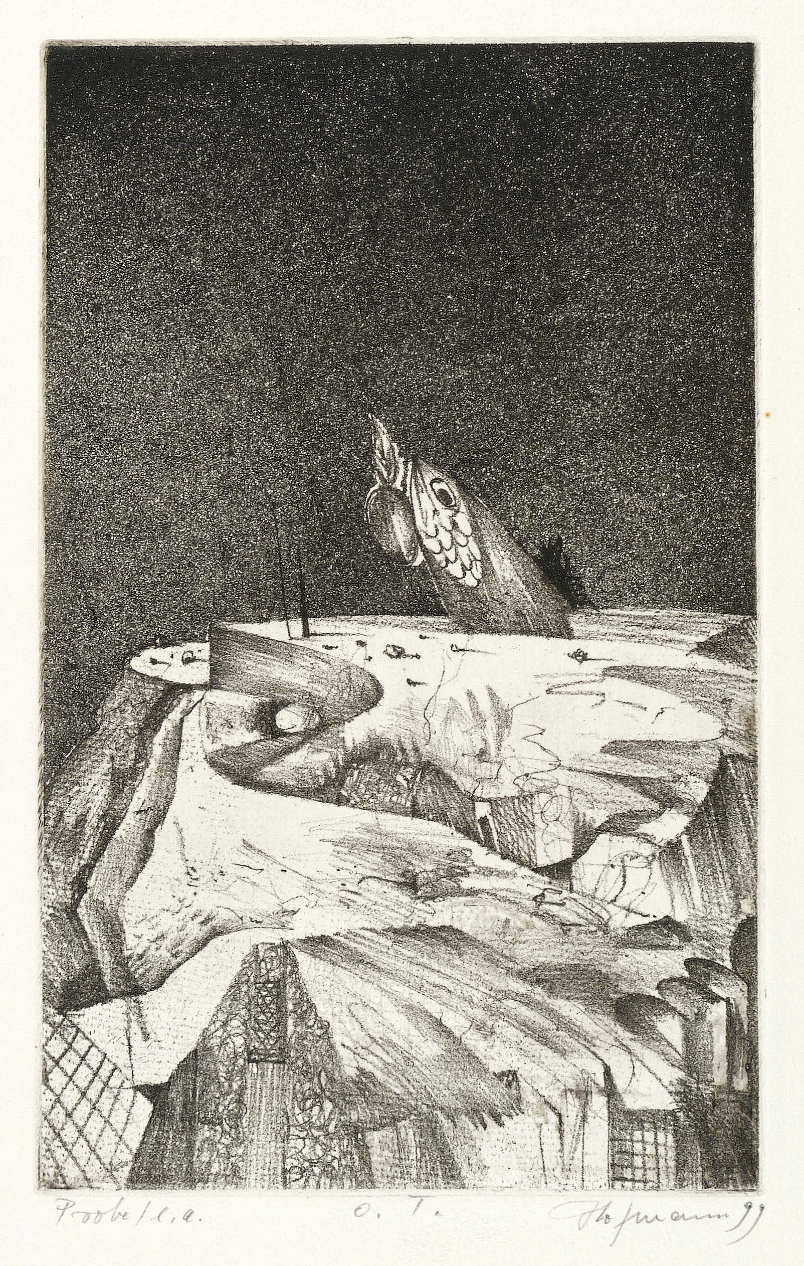 1999. Radierung / Vernis mou & Aquatinta, in Schwarz, auf chamois Büttenkarton. – Von Günter Hofmann. – Probedruck. – 25,4 x 15,9 cm (Darstellung / Platte), 40 x 28,5 cm (Blatt).
