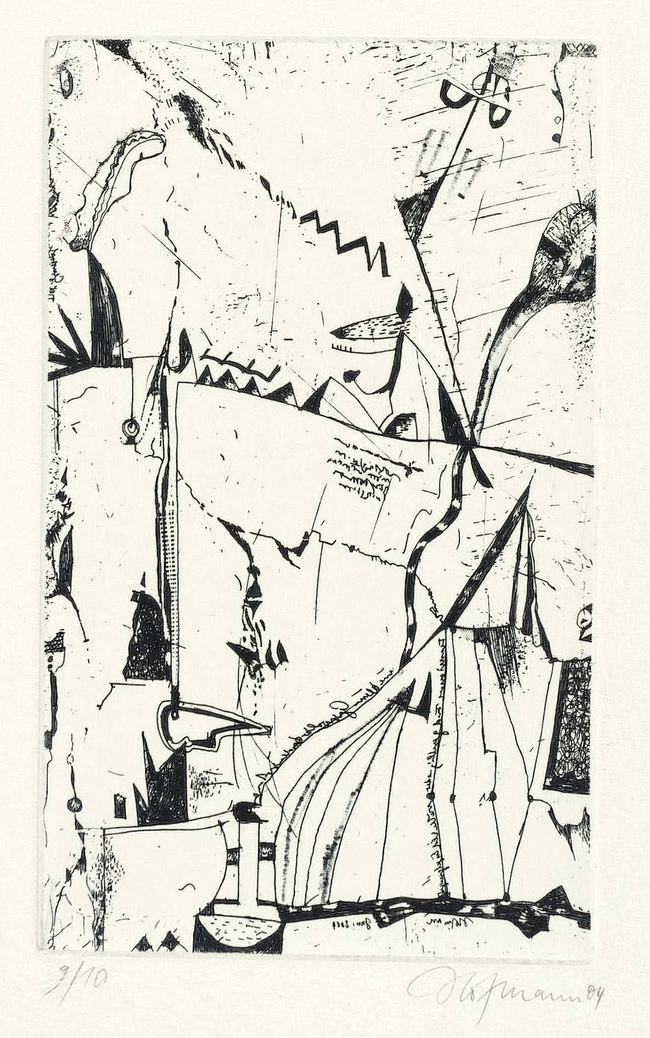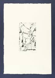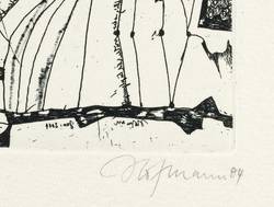 2004. Radierung / Strichätzung & Roulette, in Schwarz, auf hellgelbem Büttenkarton. – Von Günter Hofmann. – Auflage Exemplar Nr. 9/10. – 16,1 x 9,7 cm (Darstellung / Platte), 39,5 x 27 cm (Blatt).