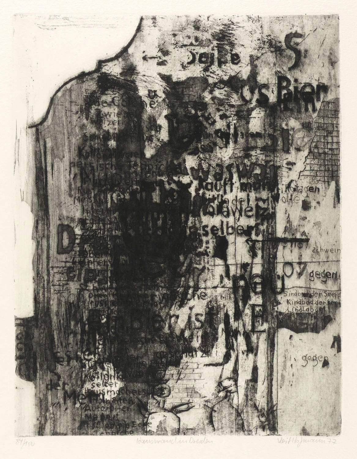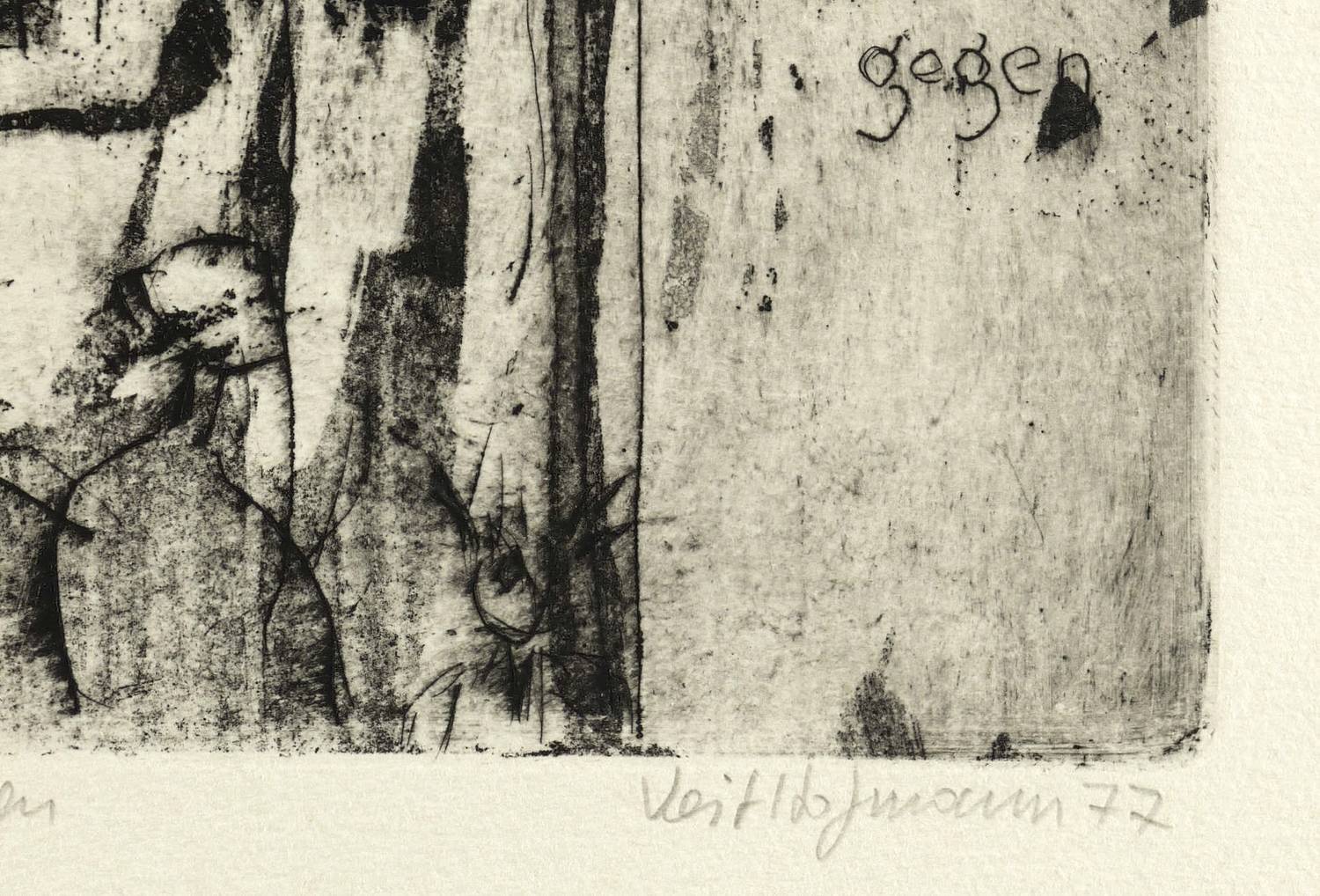 1977. Radierung / Aquatinta, Reservage & Strichätzung, in Schwarz, auf hellgelbem Büttenkarton. – Originale Künstlergrafik, von Veit Hofmann. – Auflage Exemplar Nr. 84/100. – 31,8 x 24,7 cm (Darstellung / Platte), 53,5 x 39,5 cm (Blatt).