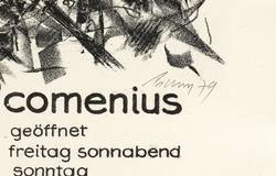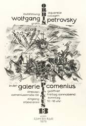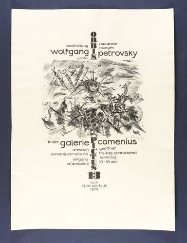 Rechts unten in Bleistift signiert und datiert. Links Titel. Ober- und unterhalb typografisch bezeichnet: ″ORBIS PICTUS 13 // ausstellung / wolfgang petrovsky / grafik aquarelle collagen″. – Originalgrafisches Künstlerplakat zur Ausstellung des Künstlers in der Galerie Comenius in Dresden 1979 (Reihe Orbis Pictus 13). – Geringfügige Randmängel. Insgesamt guter Zustand.