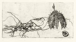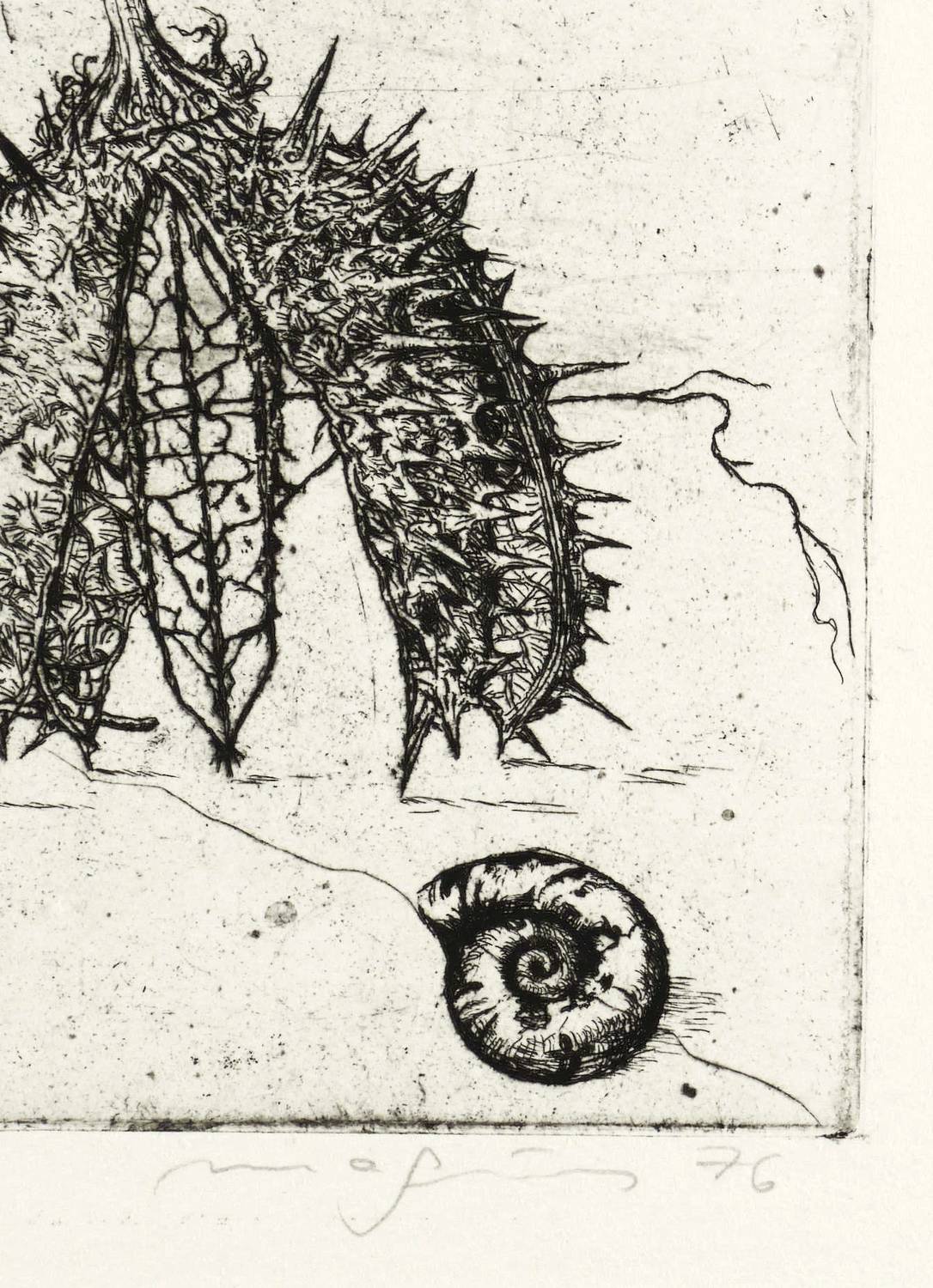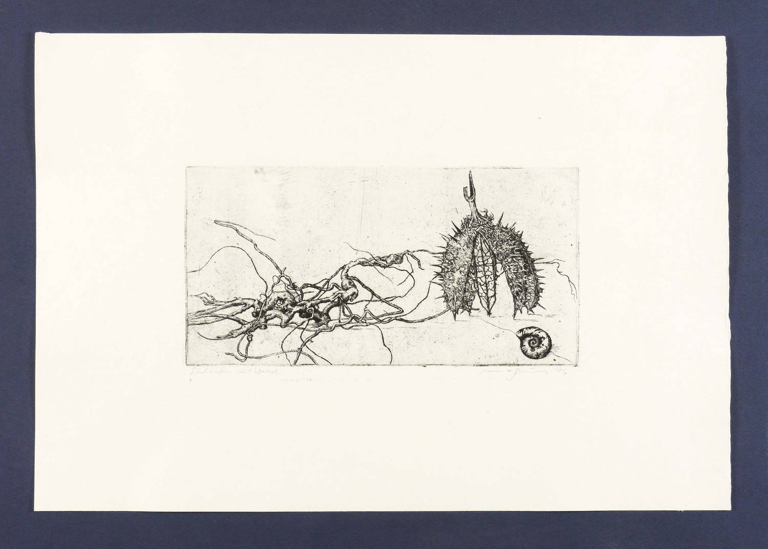 1976. Radierung / Strichätzung, mit Plattenton, in Schwarz, auf Hahnemühle-Bütten. – Originale Künstlergrafik, von Klaus Magnus. – 13,9 x 27,2 cm (Darstellung / Platte), 33 x 48 cm (Blatt).