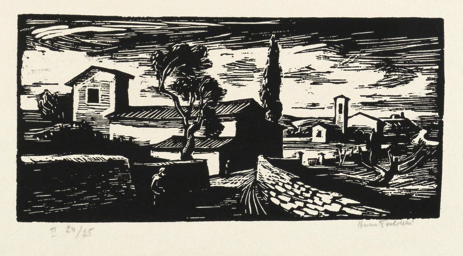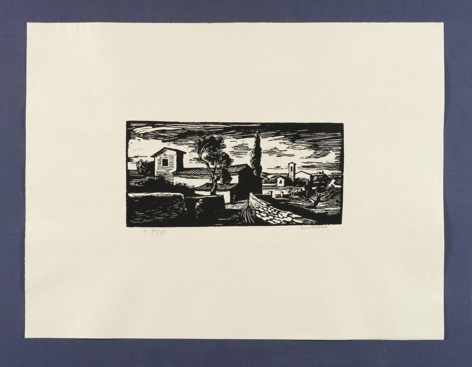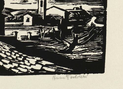 1948. Holzschnitt, in Schwarz, auf getöntem Maschinenbütten. – Originale Künstlergrafik, von Herbert Tucholski. – Auflage Exemplar Nr. 24/25. – 12,6 x 25,9 cm (Darstellung / Druckstock), 38 x 50 cm (Blatt).
