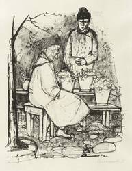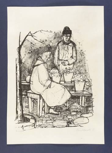 1958. Lithografie / Kreide- & Pinsellithografie, in Schwarz, auf elfenbeinfarbenem Karton. – Originale Künstlergrafik, von Heinrich Burkhardt. – 41,7 x 32,2 cm (Darstellung / Druckbild), 55 x 39 cm (Blatt).