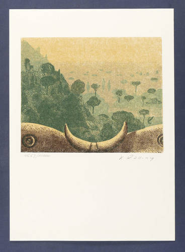 1975. Farblinolschnitt, in 4 Farben, auf weißem Velinkarton. – Originale Künstlergrafik, von Karl Rössing. – Auflage Exemplar Nr. 4663/10000. – 21,0 x 25,9 cm (Darstellung), 42 x 30 cm (Blatt).