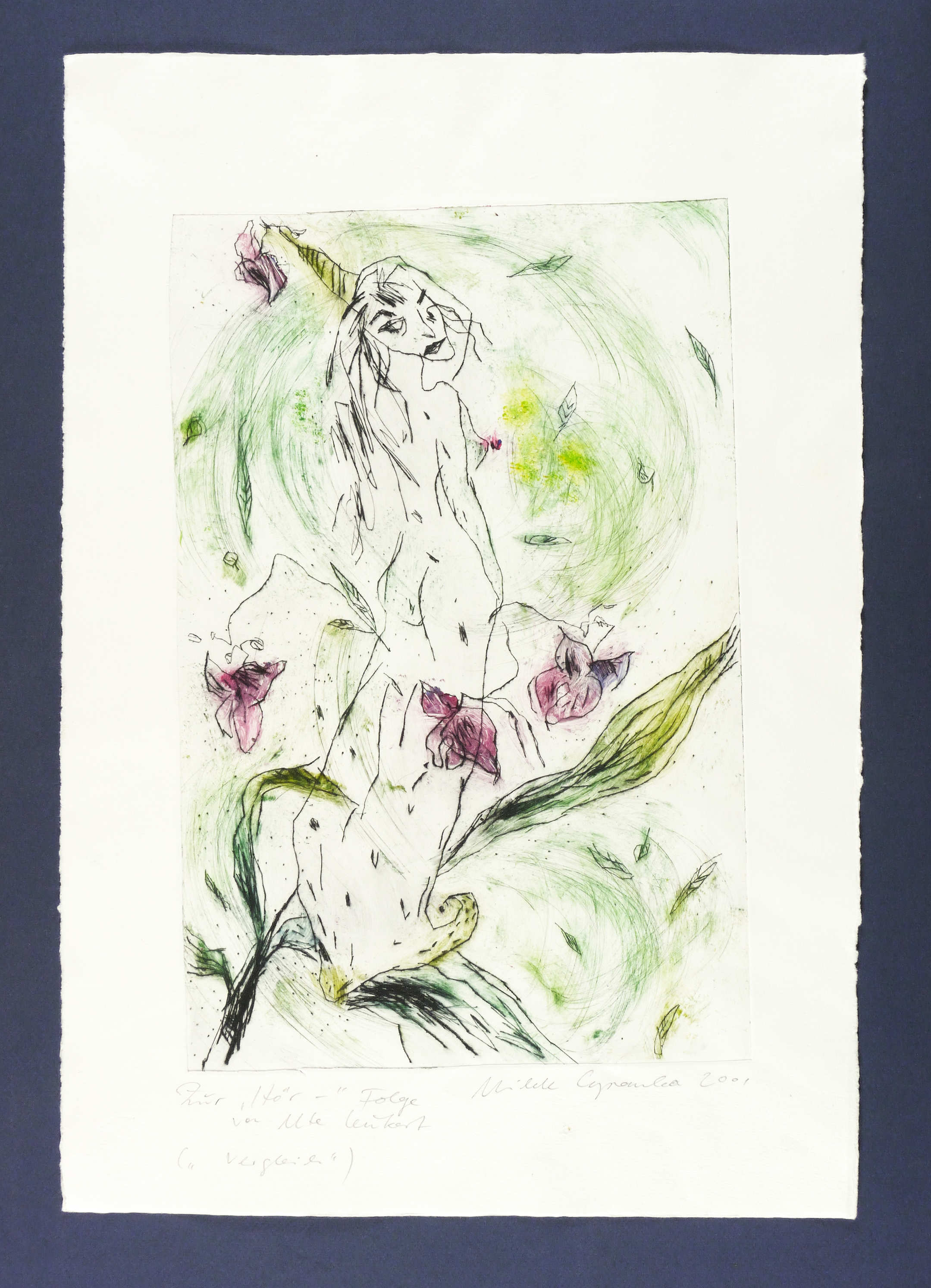2001. Farbradierung / Kaltnadel, auf hellchamois Hahnemühle-Bütten. – Originale Künstlergrafik, von Michele Cyranka. – 42,1 x 27,6 cm (Darstellung / Platte), 57 x 39 cm (Blatt).