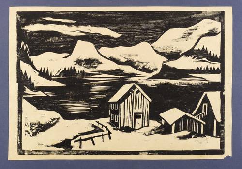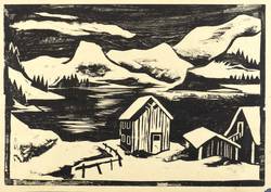 Deutscher Grafiker. – „Holzhäuser am Gebirgssee”.