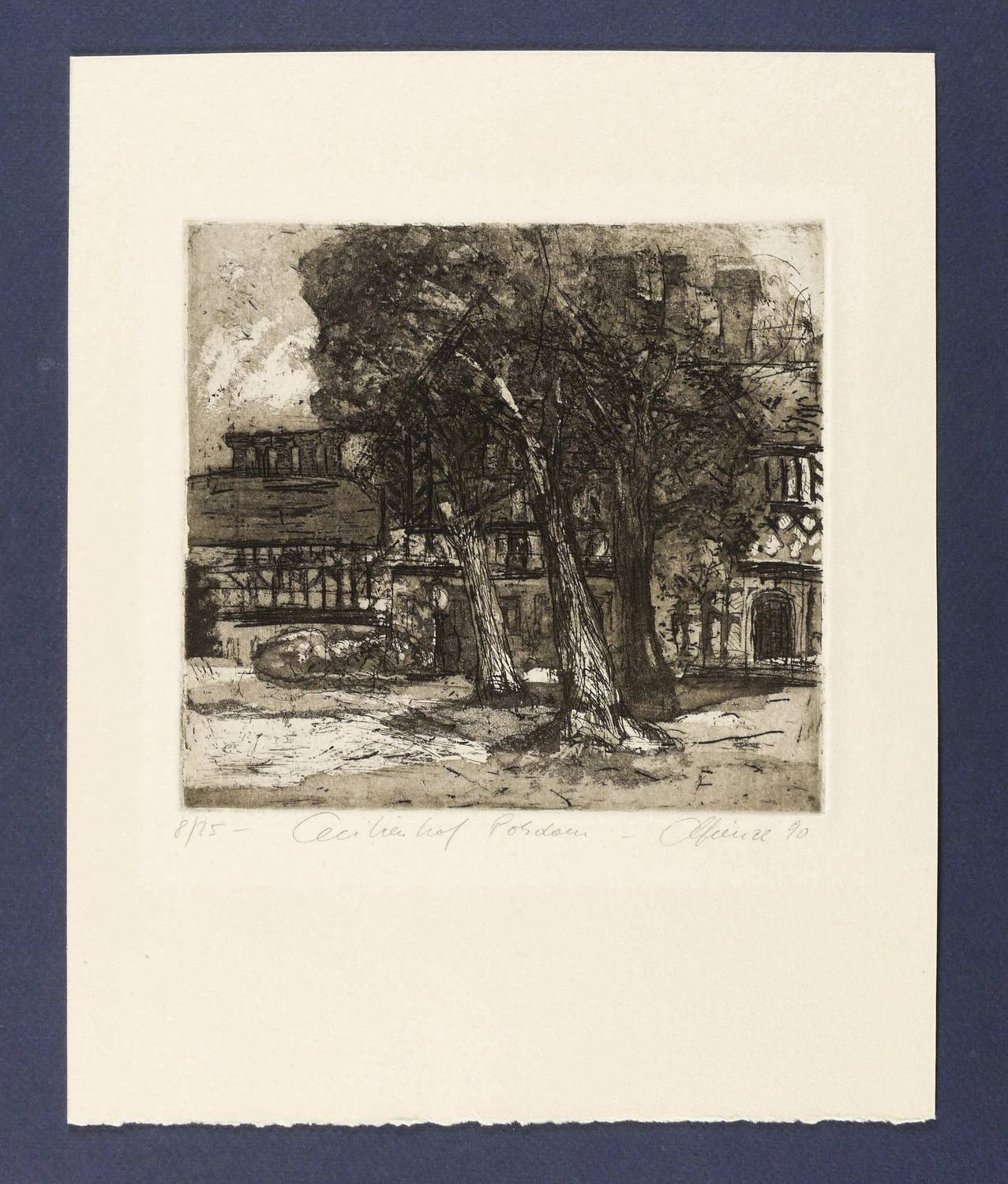 1990. Radierung / Aquatinta & Strichätzung, in Schwarz, auf gelbem Büttenkarton. – Originale Künstlergrafik, von Christian Heinze. – Auflage Exemplar Nr. 8/25. – 16,7 x 18,1 cm (Darstellung / Platte), 30 x 24,5 cm (Blatt).