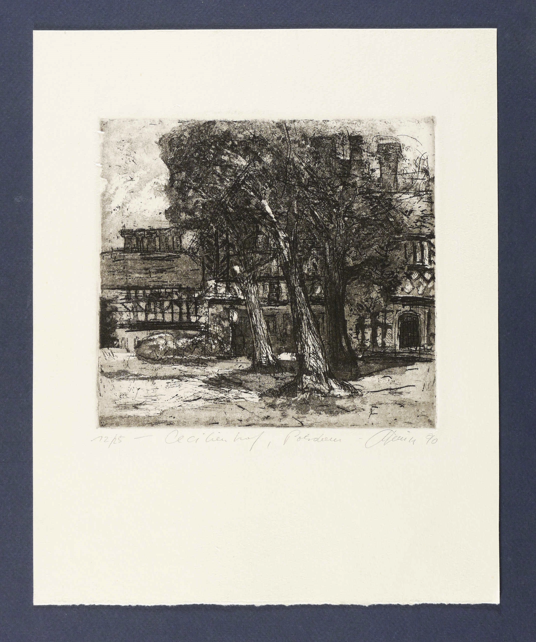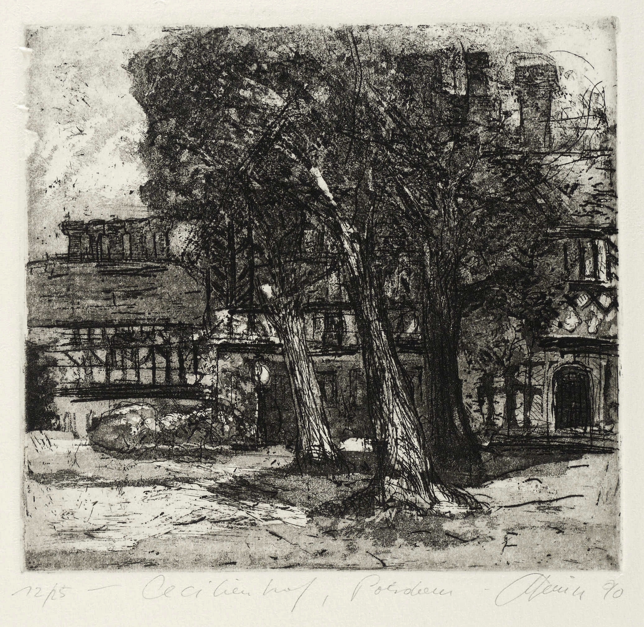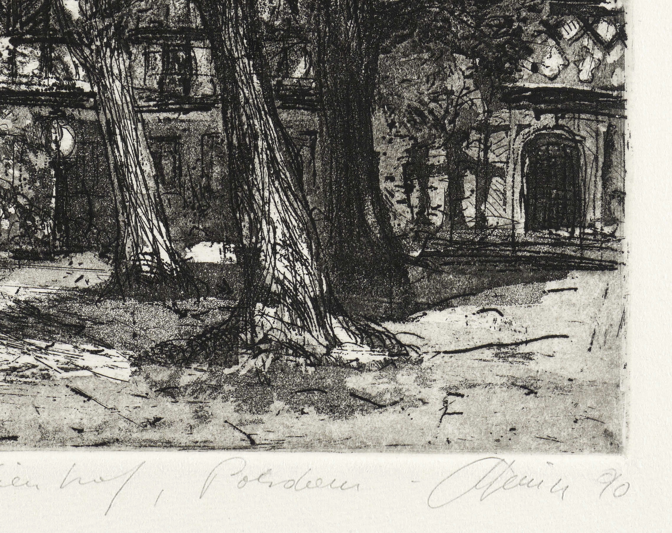 1990. Radierung / Aquatinta & Strichätzung, in Schwarz, auf hellchamois Büttenkarton. – Originale Künstlergrafik, von Christian Heinze. – Auflage Exemplar Nr. 12/25. – 16,6 x 18,1 cm (Darstellung / Platte), 30,5 x 24,5 cm (Blatt).