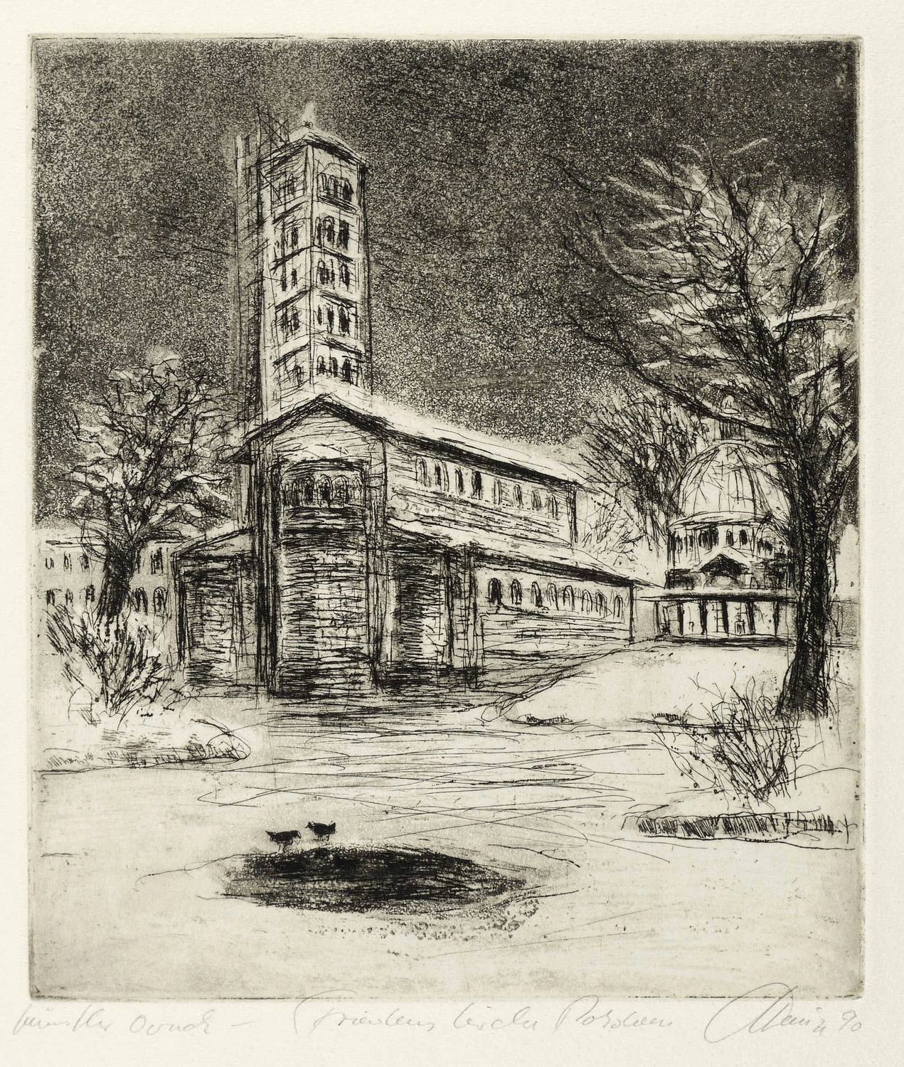 1990. Radierung / Aquatinta & Strichätzung, in Schwarz, auf hellchamois Büttenkarton. – Originale Künstlergrafik, von Christian Heinze. – Künstlerexemplar (e.a.). – 18,9 x 16,1 cm (Darstellung / Platte), 32 x 26,5 cm (Blatt).