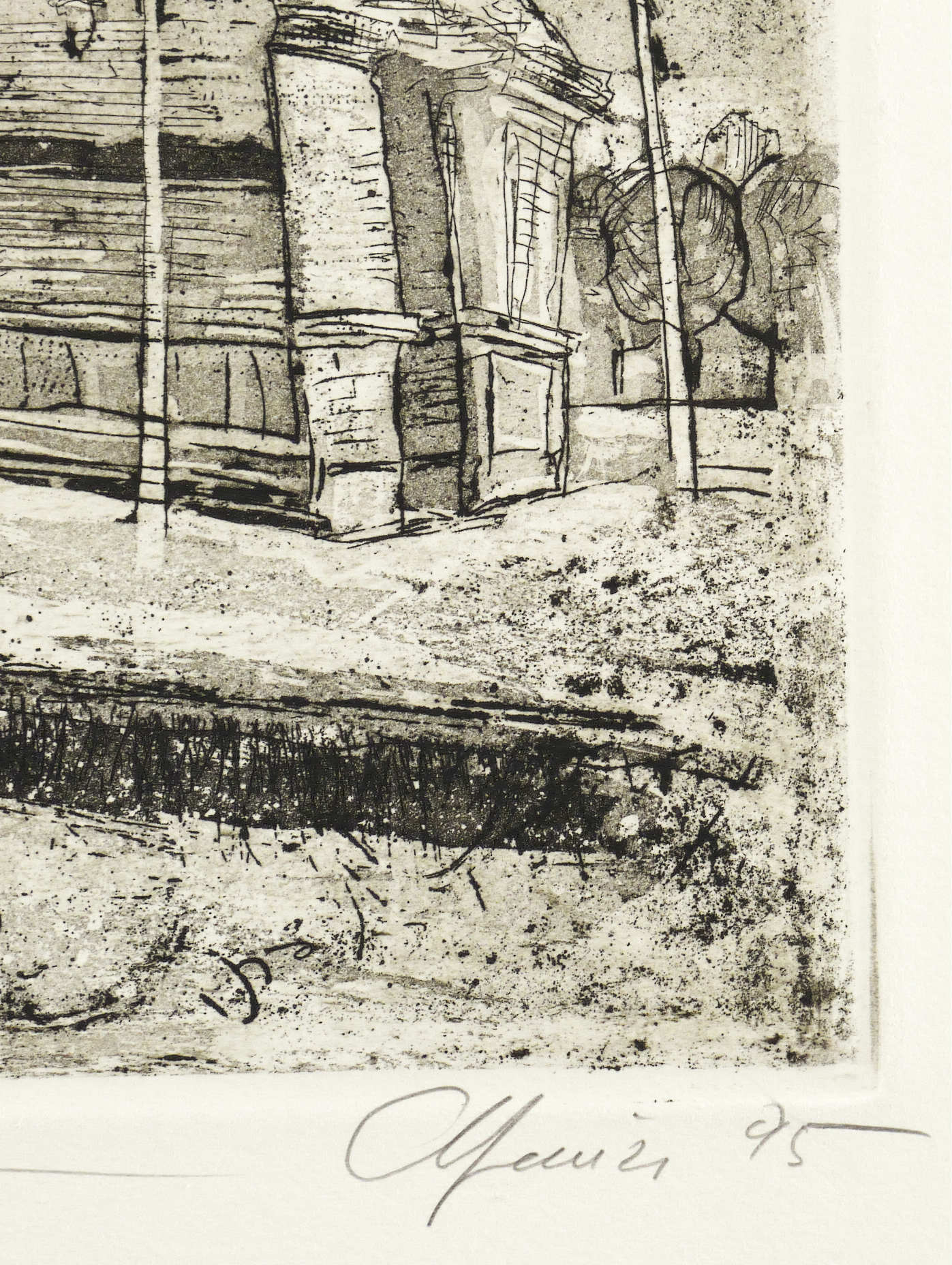1995. Radierung / Aquatinta & Strichätzung, in Schwarz, auf hellchamois Büttenkarton. – Originale Künstlergrafik, von Christian Heinze. – Auflage Exemplar Nr. 13/60. – 24,0 x 29,2 cm (Darstellung), 24,7 x 29,8 cm (Platte), 38 x 54 cm (Blatt).